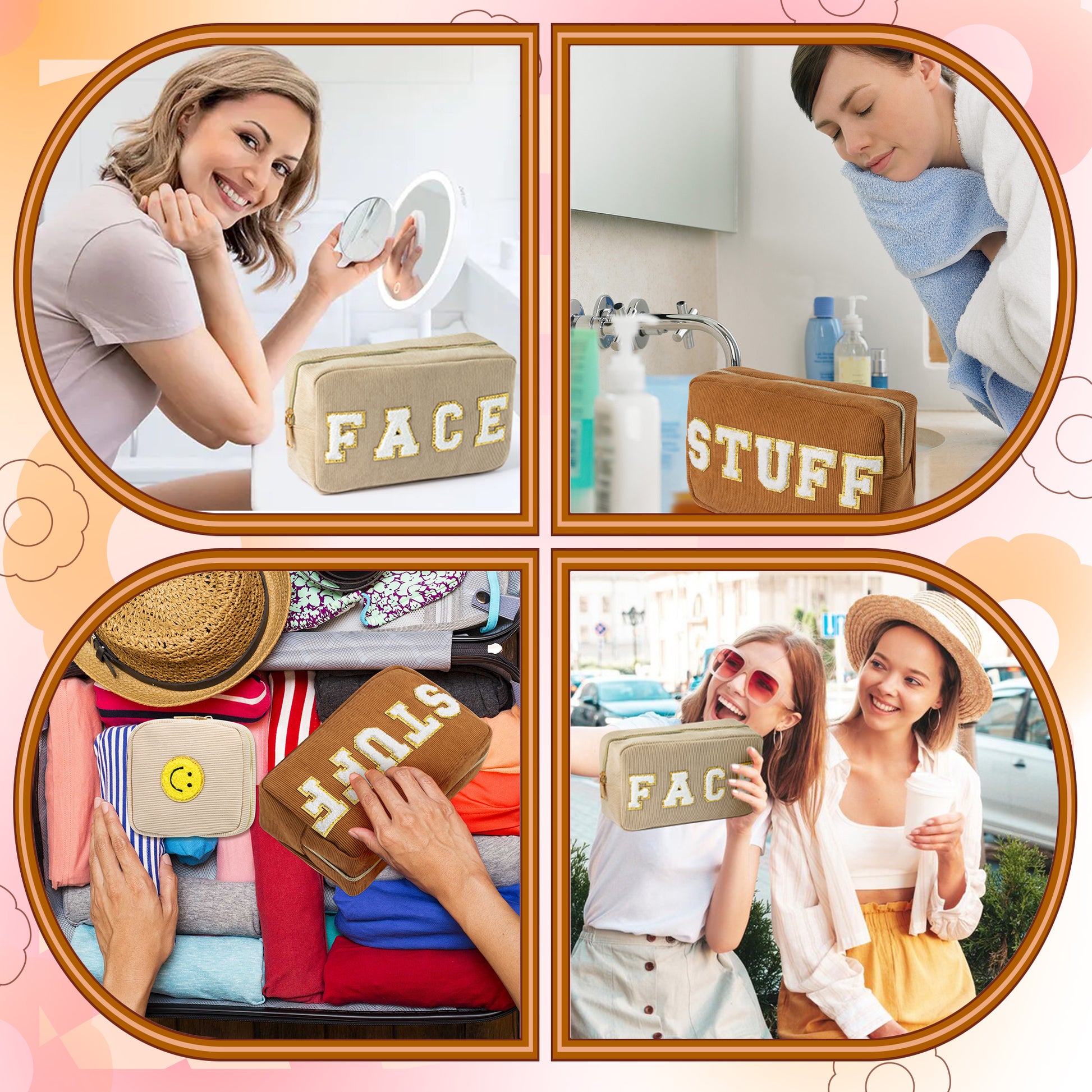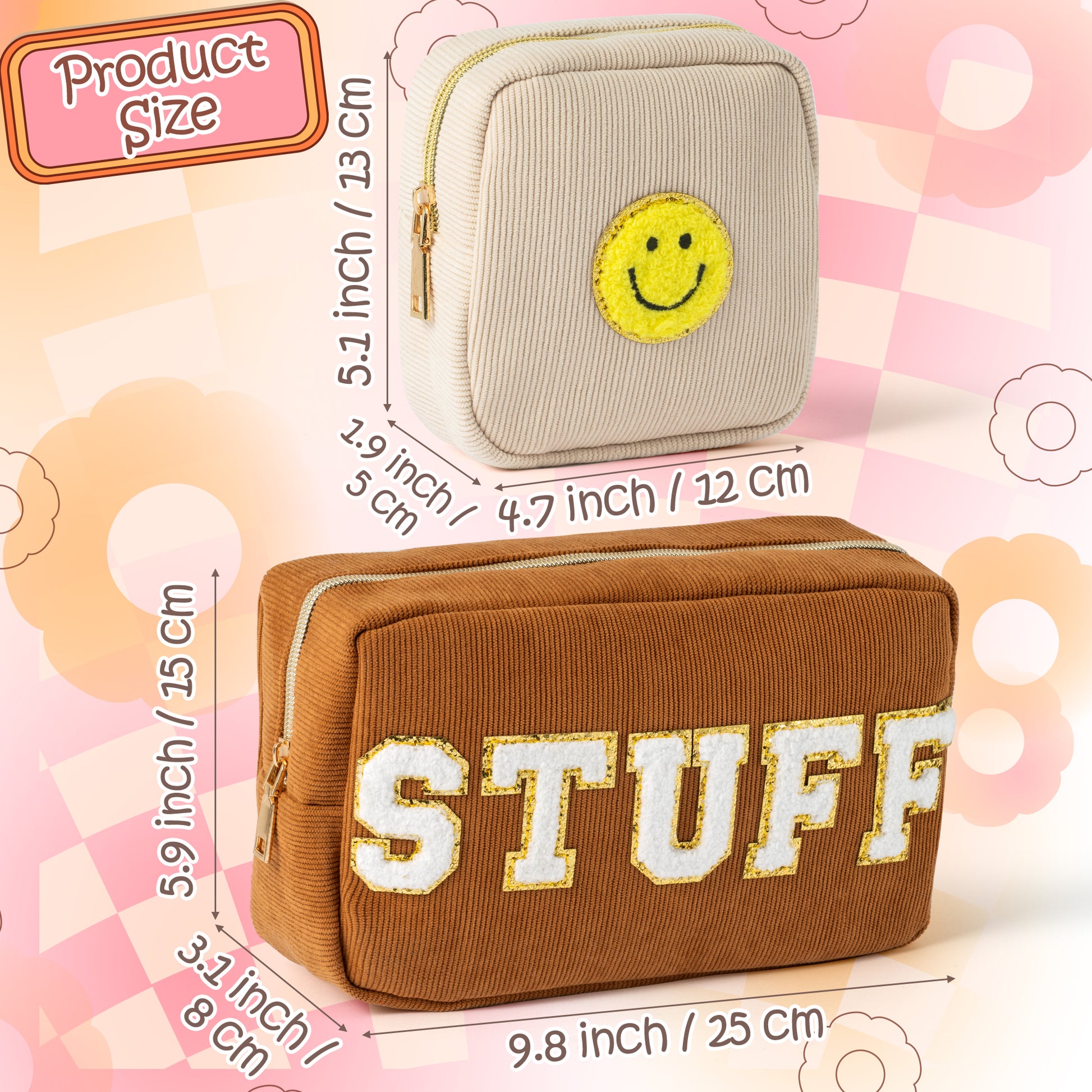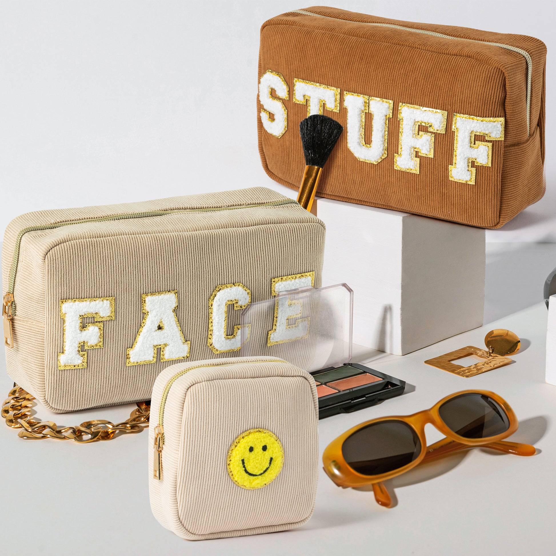 - Trendy Design: These corduroy makeup bags set is a stylish and practical for storing and organizing your cosmetics and beauty essentials. You will get 2 pieces letter patch cosmetic bag-FACE and STUFF, and a small smile patch makeup bag. These bags have unique texture and aesthetic appeal, which come in a variety of rich, fashionable colors that are in line with the latest trends.