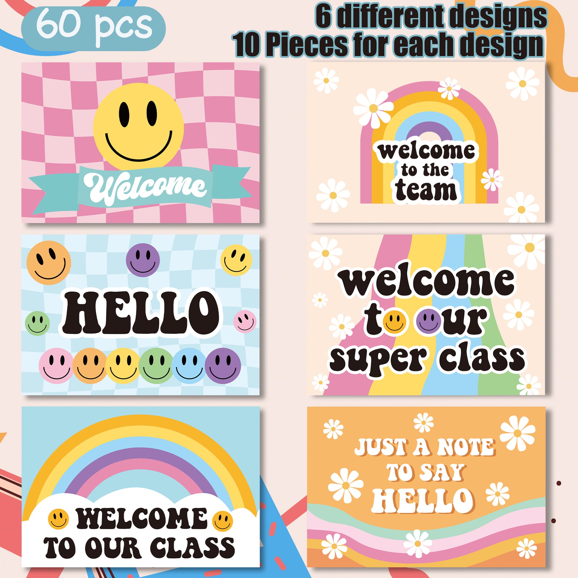 LieToi 60Pcs Welcome Postcards Back to School Supplies - 4 x 6 Inch Welcome to Our Class Blank Hello Greeting Cards Groovy Hippie Boho Daisy Smile Post Cards Gift Student Teacher Preschool Supplies