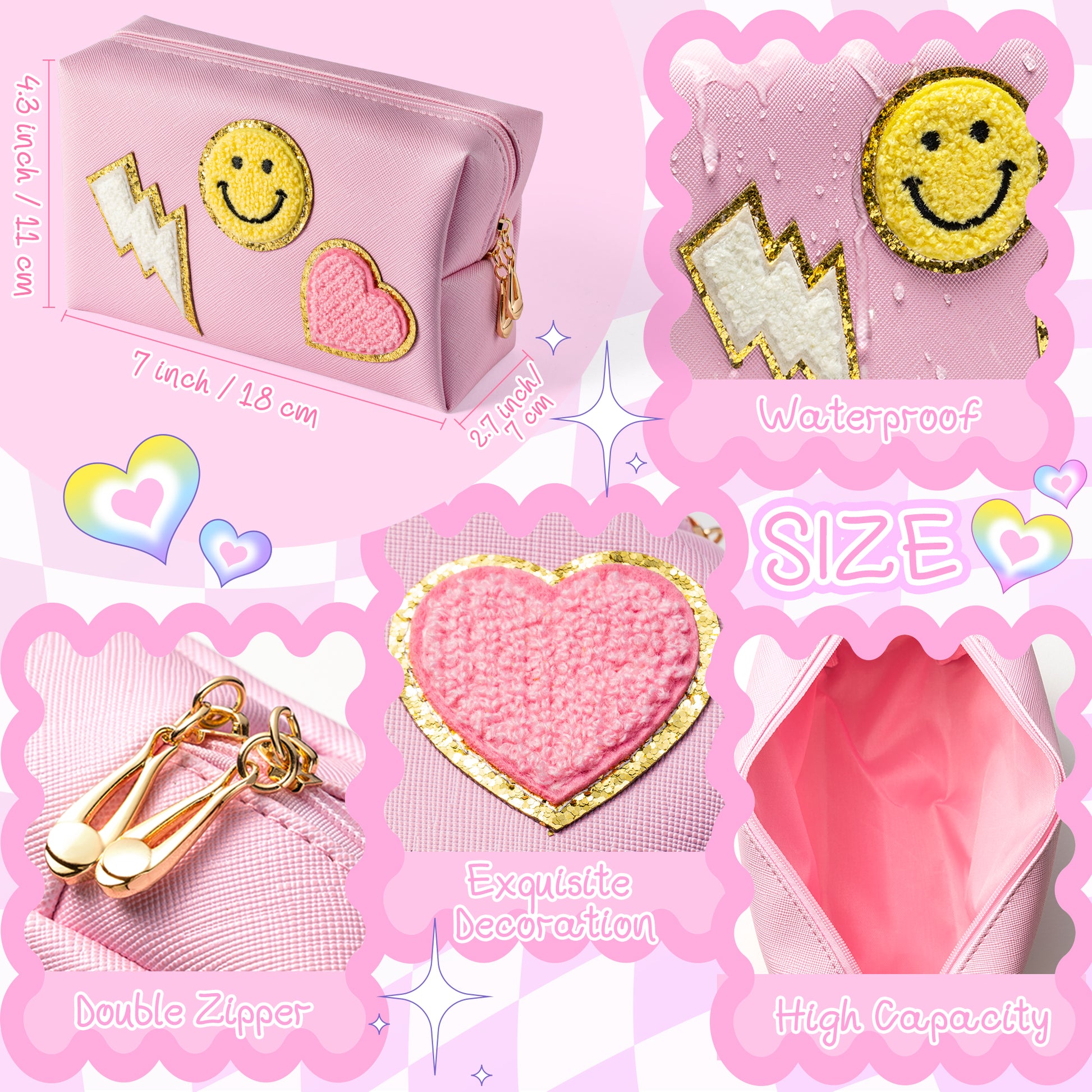 Preppy Design: The toiletry bag set is preppy patch theme. The makeup bag is in pink color, there are three trendy and lovely patterns - smile, lightning and heart. The colorful Heishi surfer bracelets designed by kinds of special elements - golden beads, colorful vinyl disc, smile, evil eye and so on. The earrings are in different styles, such as smile, lightning bolt and star. And various preppy vinyl aesthetic stickers.