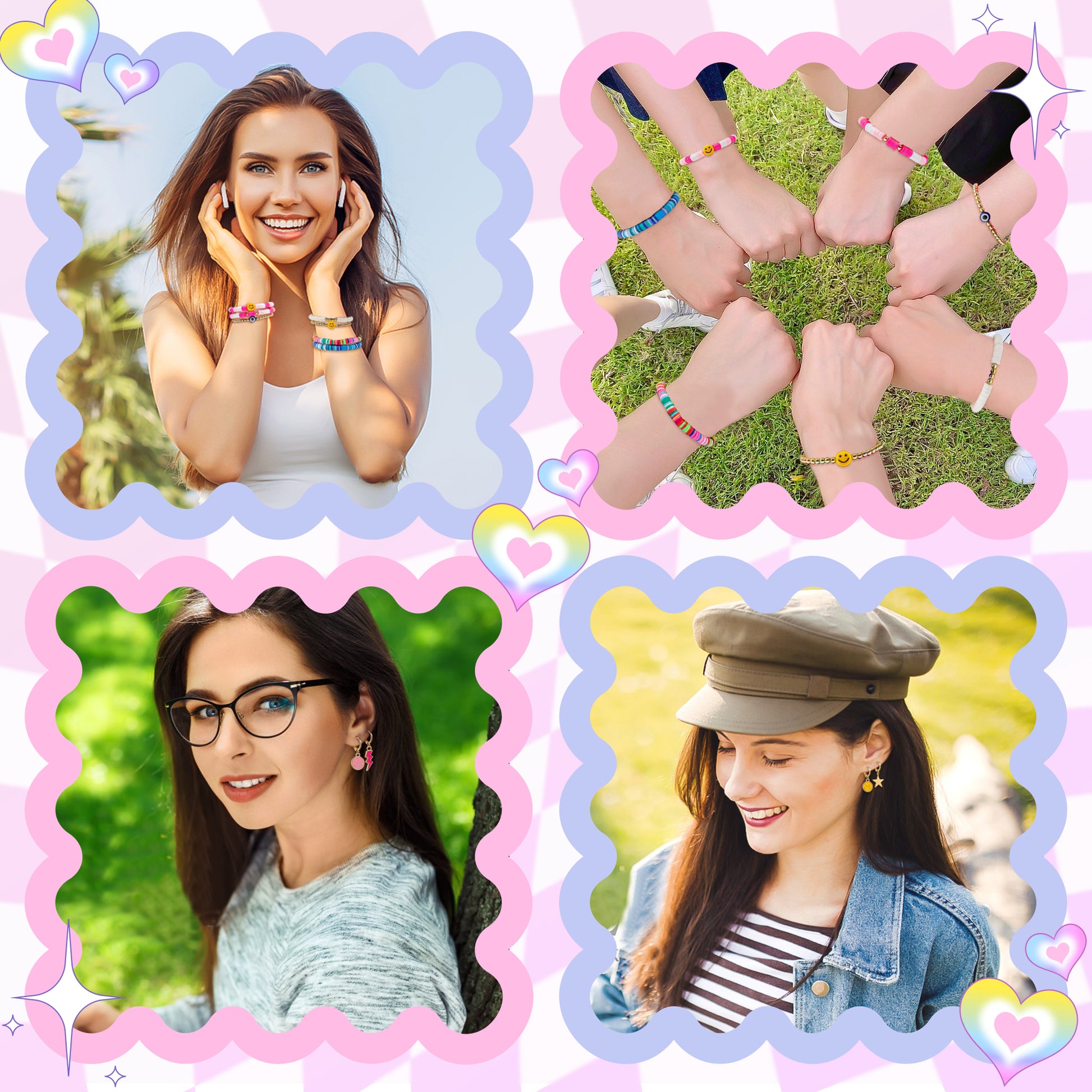 Value Package: You will get a pink preppy cosmetic bag, 4 pairs of lovely Y2K earrings, 7 pieces colorful Heishi bracelets, and 52 pieces preppy stickers. Unique design and bright colors can meet your daily needs.