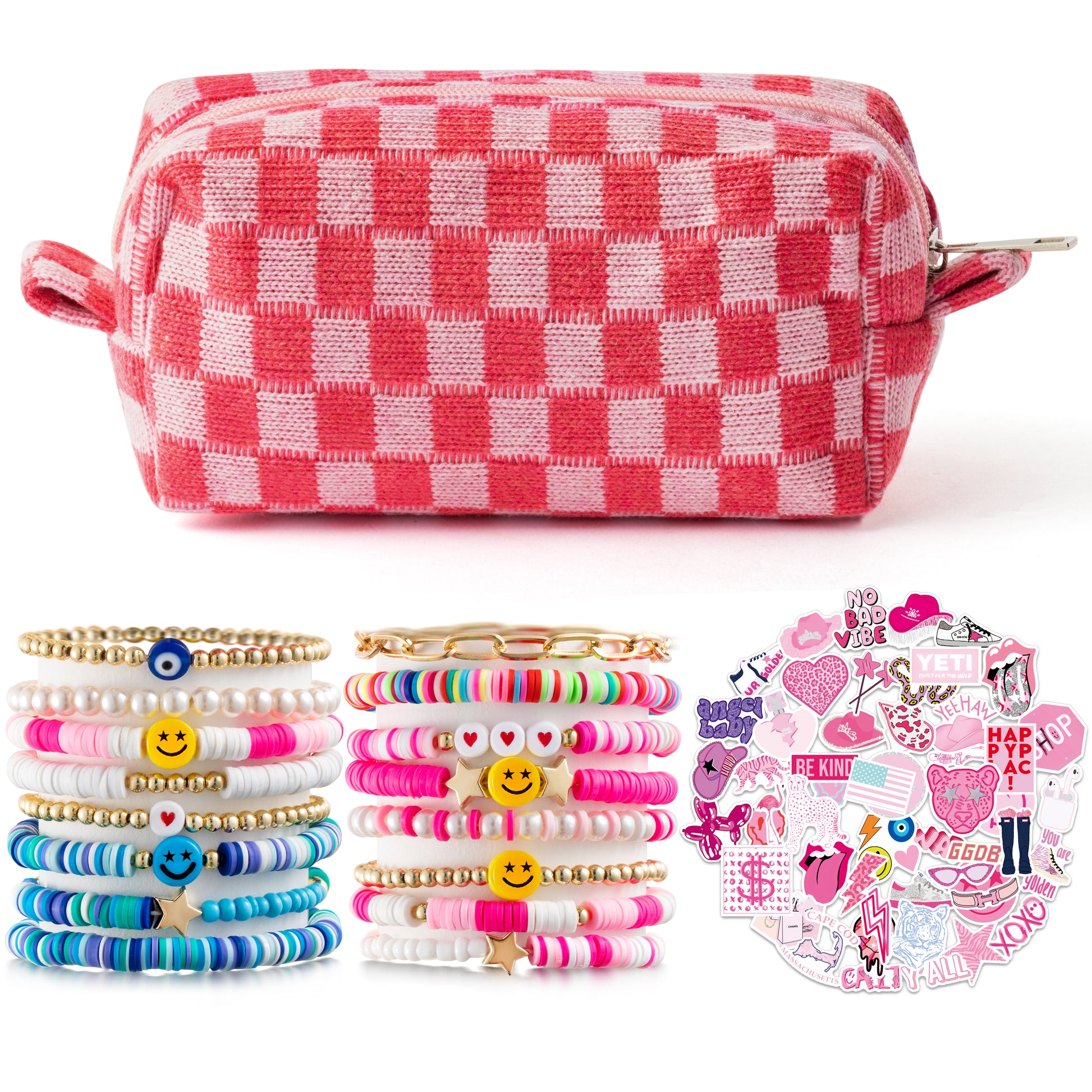 - Value Package: You will get a pink checkered cosmetic bag, 16 pieces colorful Heishi bracelets, and 50 pieces preppy stickers, which offer a delightful combination of accessories that show style and personality.Unique design and bright colors can meet your daily needs.