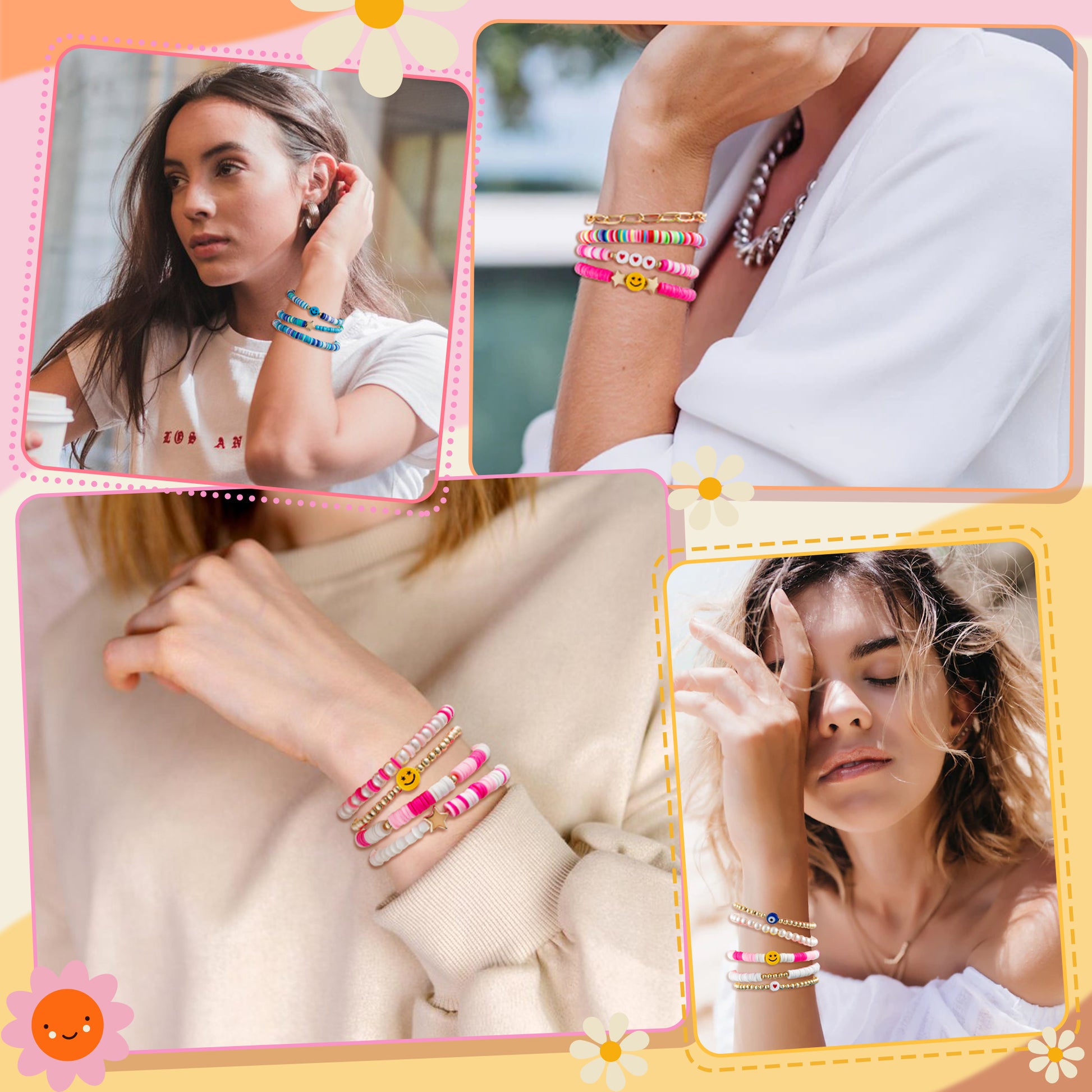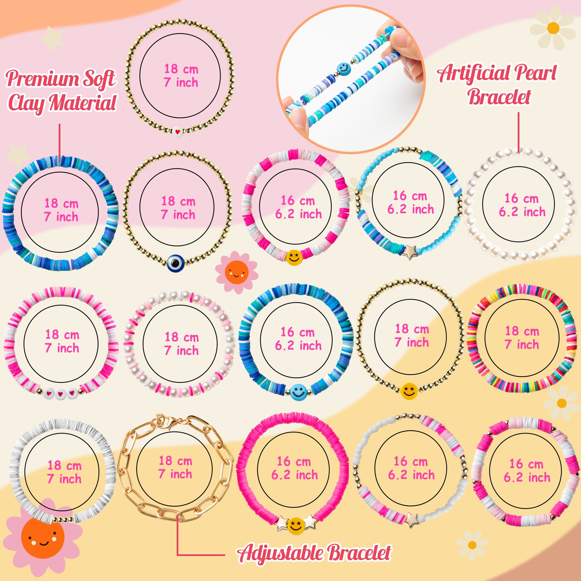 - Preppy Heishi Surfer Bracelets: 15 Pieces made of premium soft clay and acrylic material and the one of paper clip bracelet is alloy. These bracelets are perfect for stacking, mixing, and matching to create a personalized and effortlessly stylish look. The perimeter of stretch bracelets is about 6.2/7inch, which are suitable for most people wrist size.