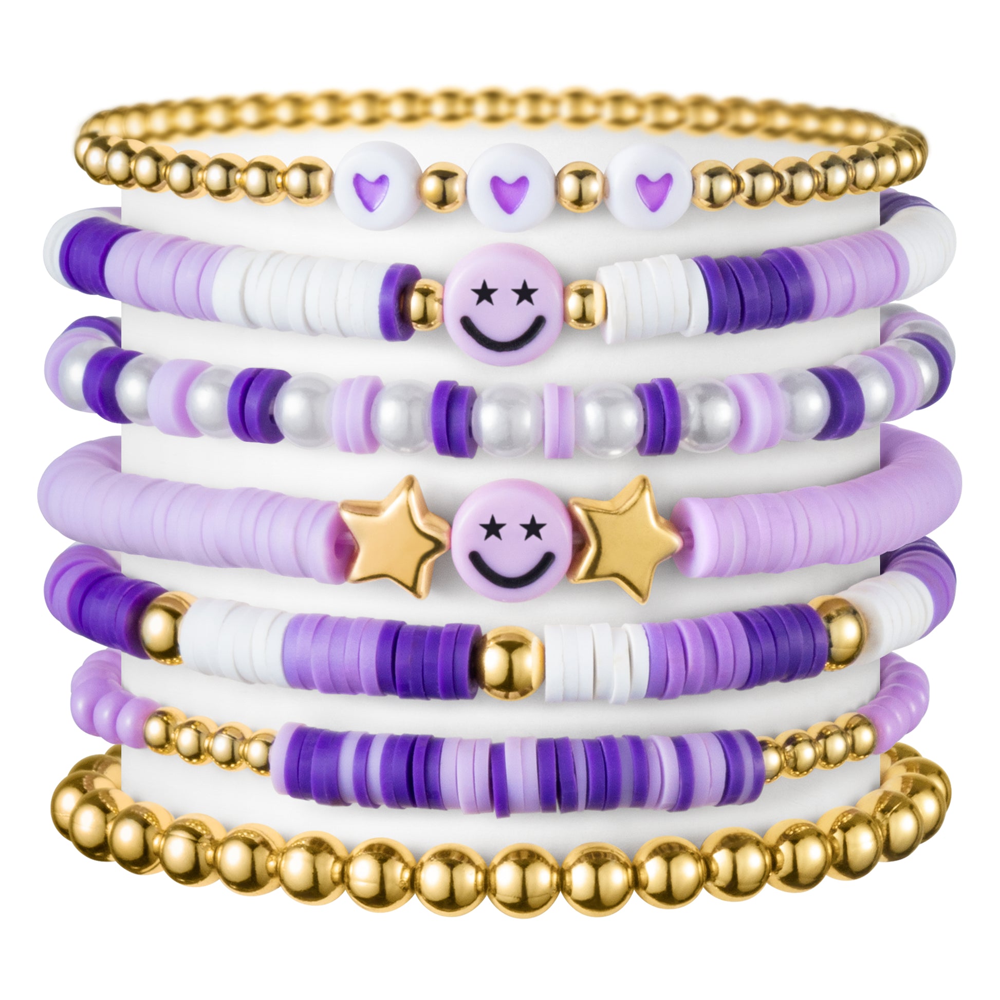 - Purple Surfer Heishi Bracelets: The package comes with 7 pieces bracelets in different style. The bracelets set is collected and designed by kinds of special elements - golden beads, purple and white vinyl clay, smile, star, and so on. These preppy Heishi Bracelets are stylish and chic accessories that exude a casual vibe.