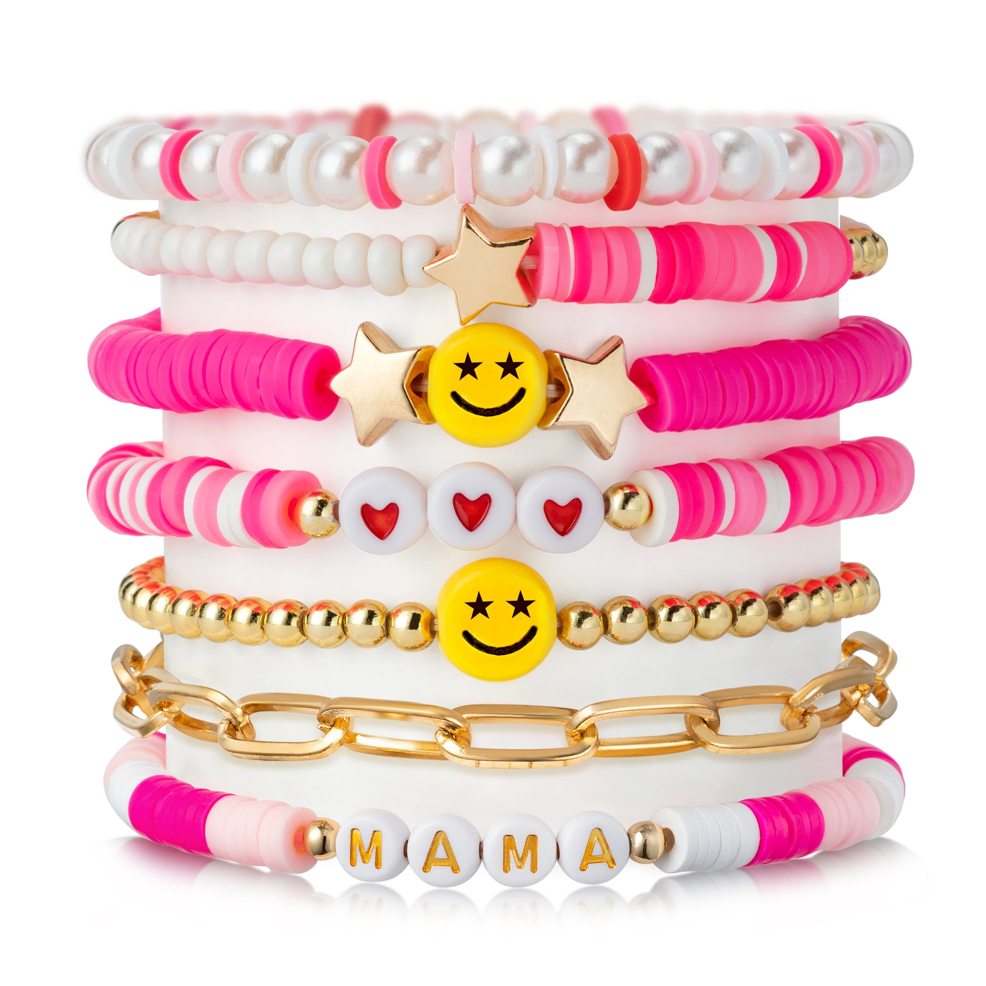 LieToi 7Pcs Preppy MAMA Heishi Bracelets Set Hot Pink Smile Heart Star Beaded Surfer Bracelets Gifts for Mom Polymer Clay Pearl Stackable Summer Beach Boho Layering Stretch Birthday Mothers Day Gifts