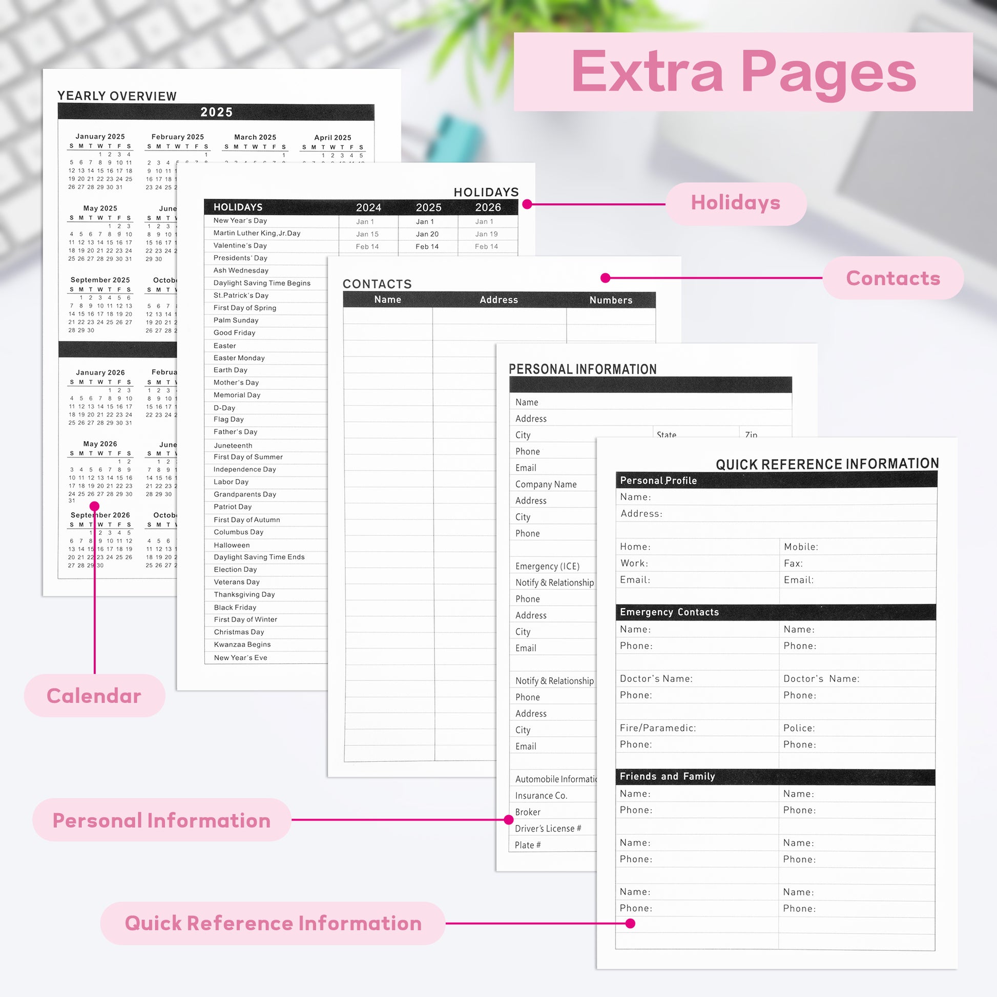 - 2025 Planner: The planner can help you plan your work, study and life, it contains 12 months of monthly and weekly pages, calendars for 2025 and 2026, and an overview of holidays from 2024 to 2026. There 3 sheets planner stickers inside the back pocket