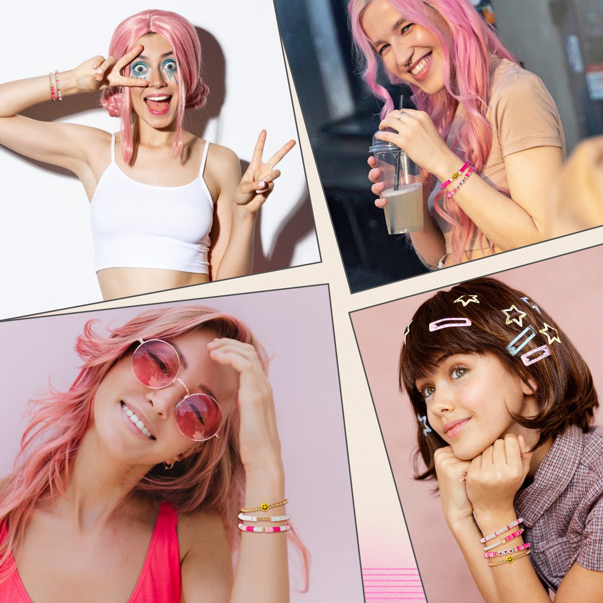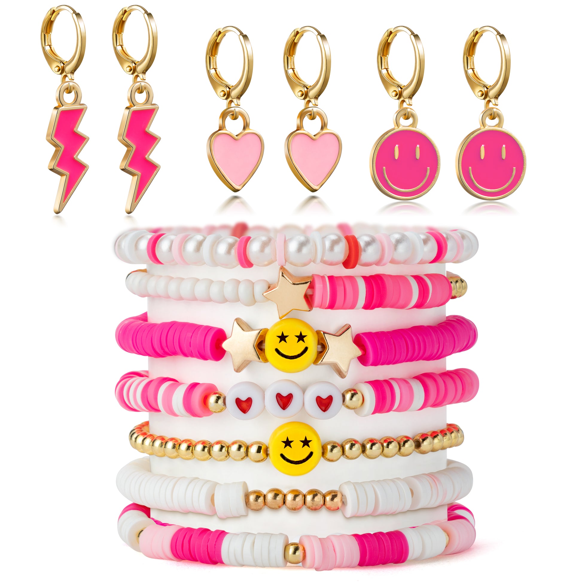 LieToi Preppy Heishi Bracelets and Earrings Kit Hot Pink Polymer Clay Stackable Disc Summer Beach Surfer Bracelets Preppy Charms Pendants Huggie Hoop Dangle Earrings Y2K Jewelry for Women Girls Gift