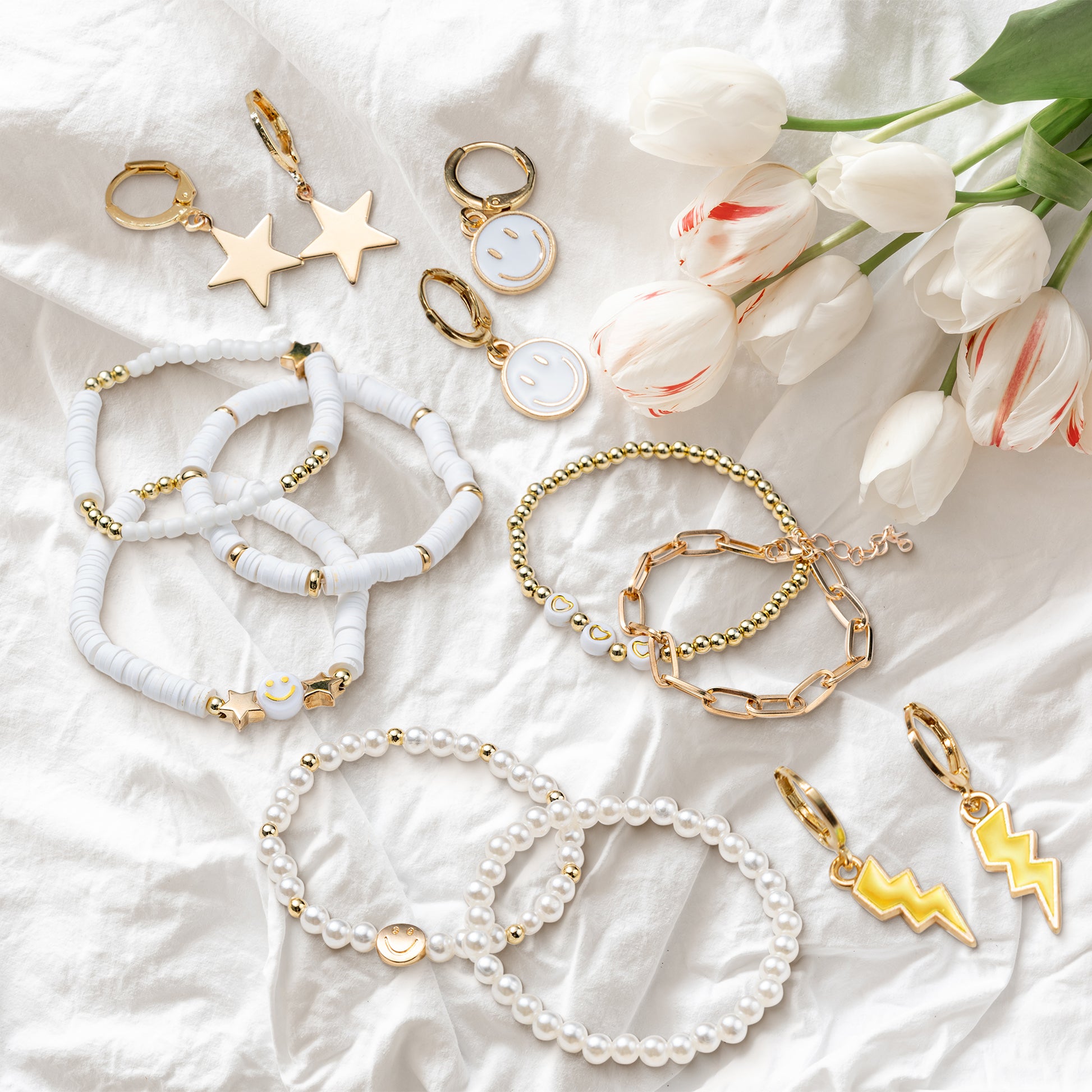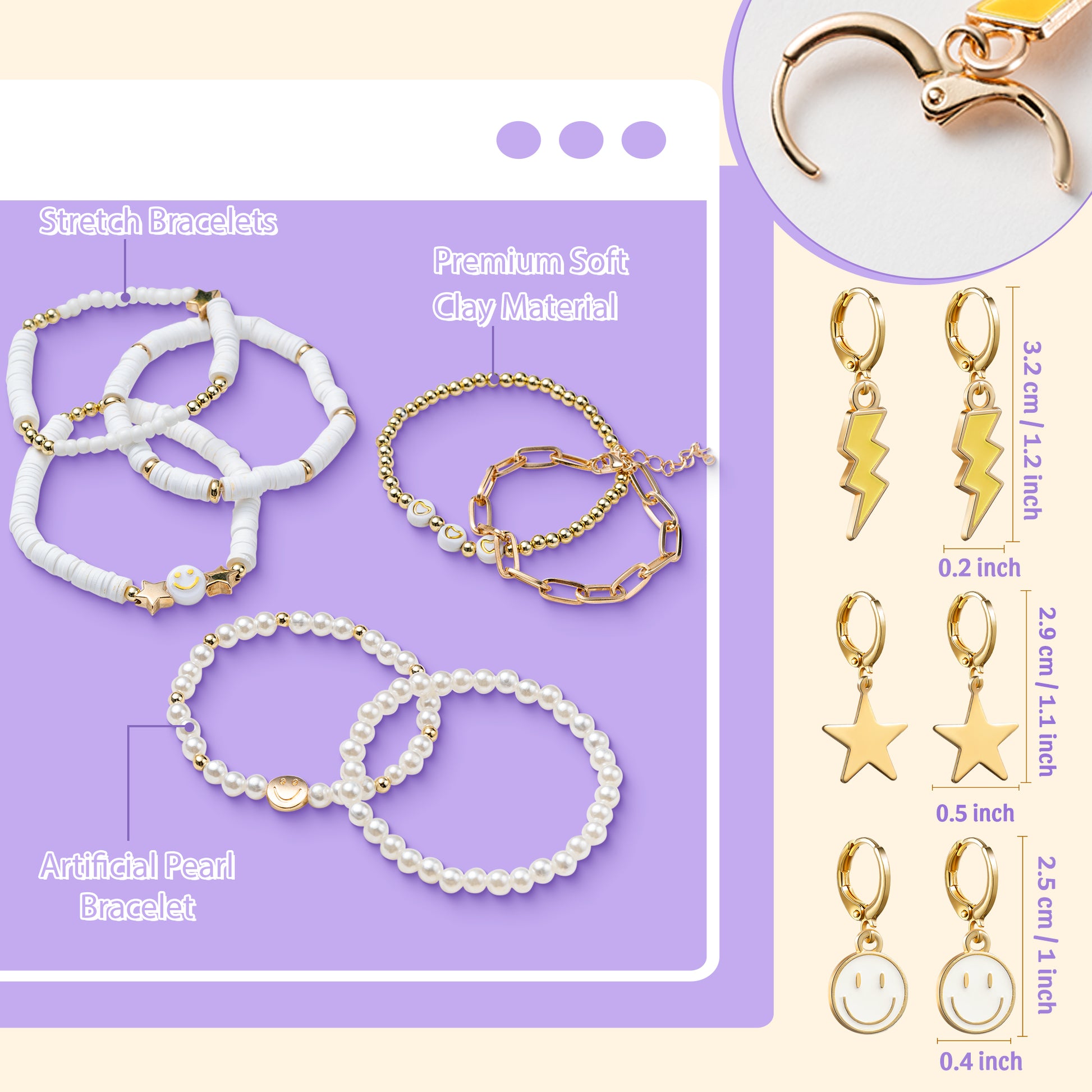LieToi Preppy Heishi Bracelets and Earrings Kit White Polymer Clay Stackable Disc Summer Beach Surfer Bracelets Preppy Charms Pendants Huggie Hoop Dangle Earrings Y2K Boho Jewelry for Women Girls Gift