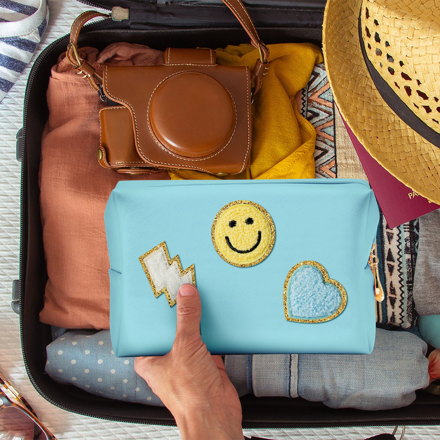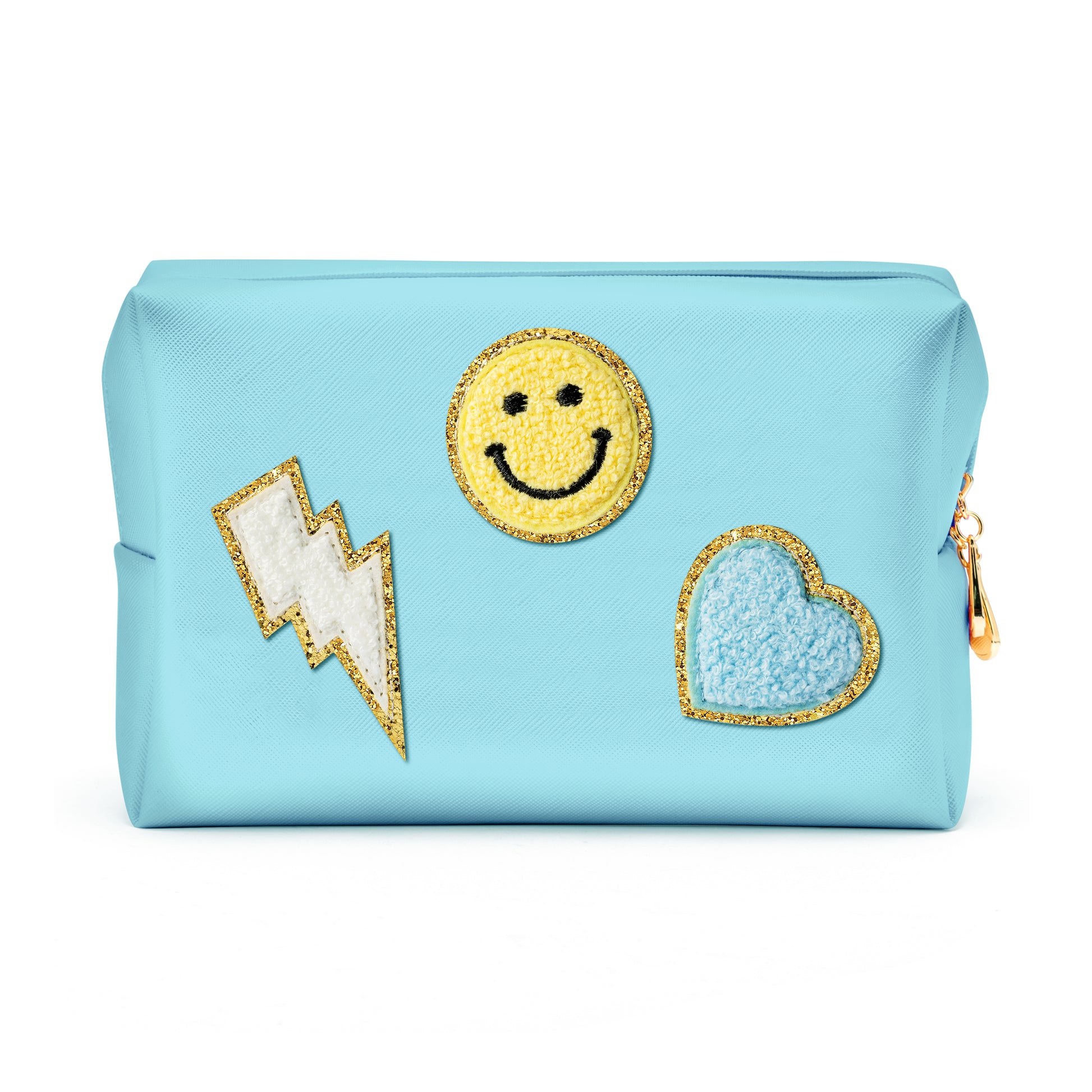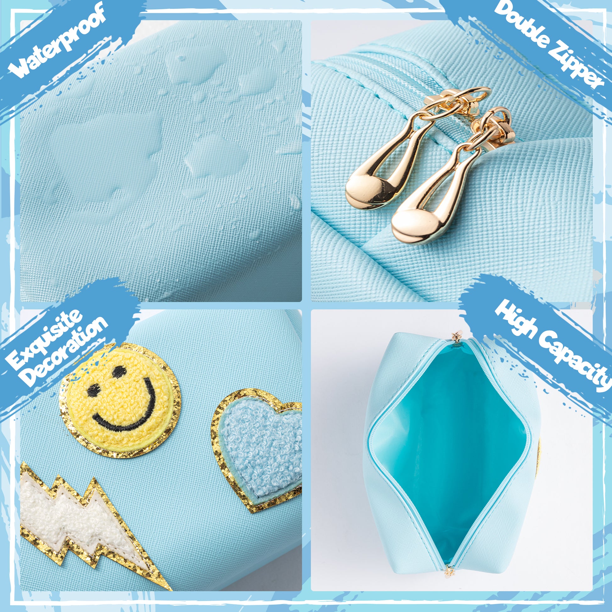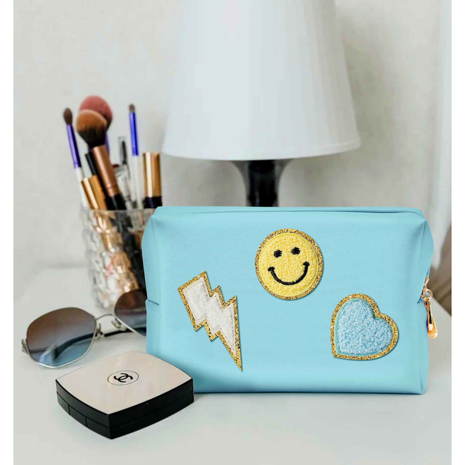 LieToi Preppy Patch Cosmetic Toiletry Bag, PU Leather Portable Waterproof Makeup Bag Smile Lightning Heart Organizer Compliant Bag Daily Travel Use Storage Purse for Women Girls (Large, Canal Blue)