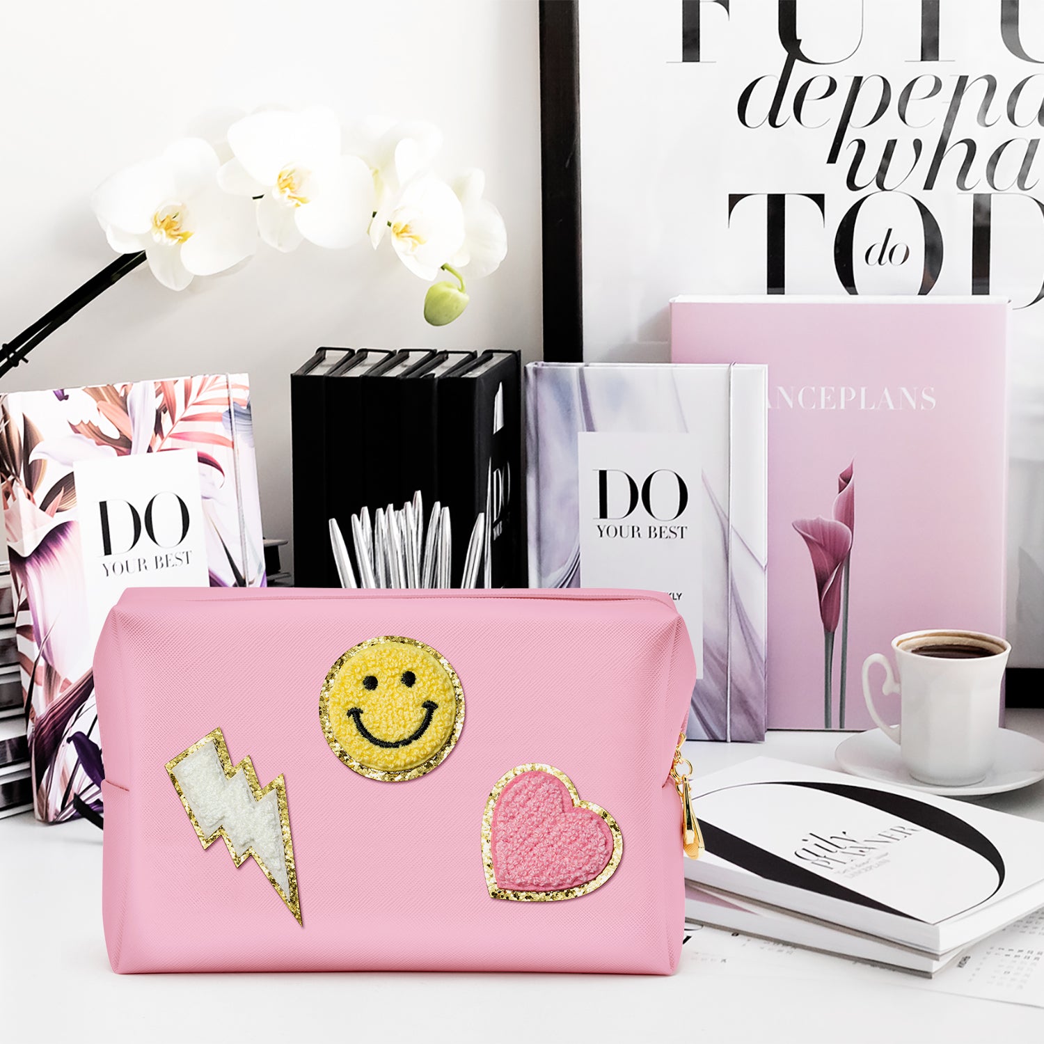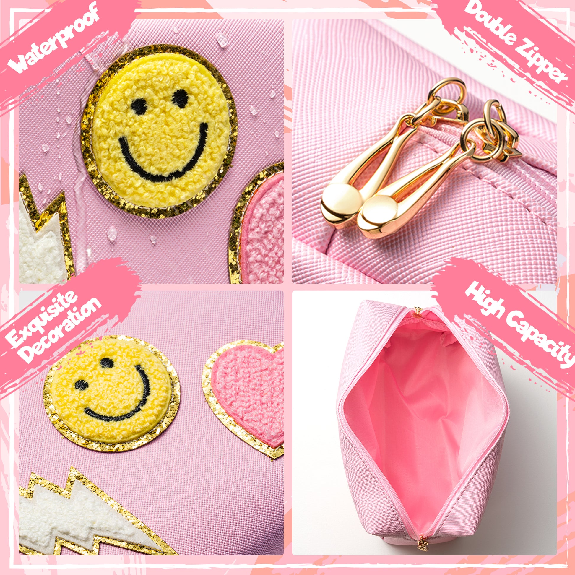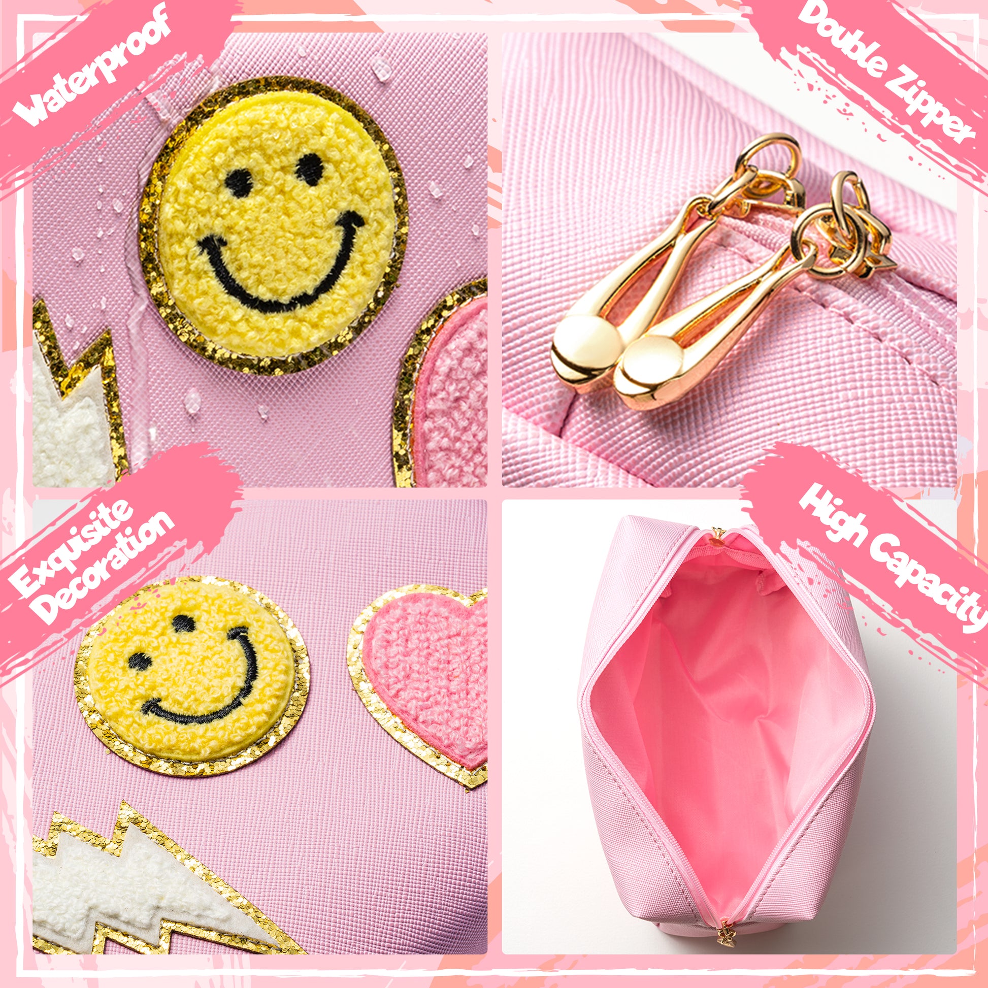 LieToi Preppy Patch Cosmetic Toiletry Bag, PU Leather Portable Waterproof Makeup Bag Smile Lightning Heart Organizer Compliant Bag Daily Travel Use Storage Purse for Women Girls (Large, Pink)
