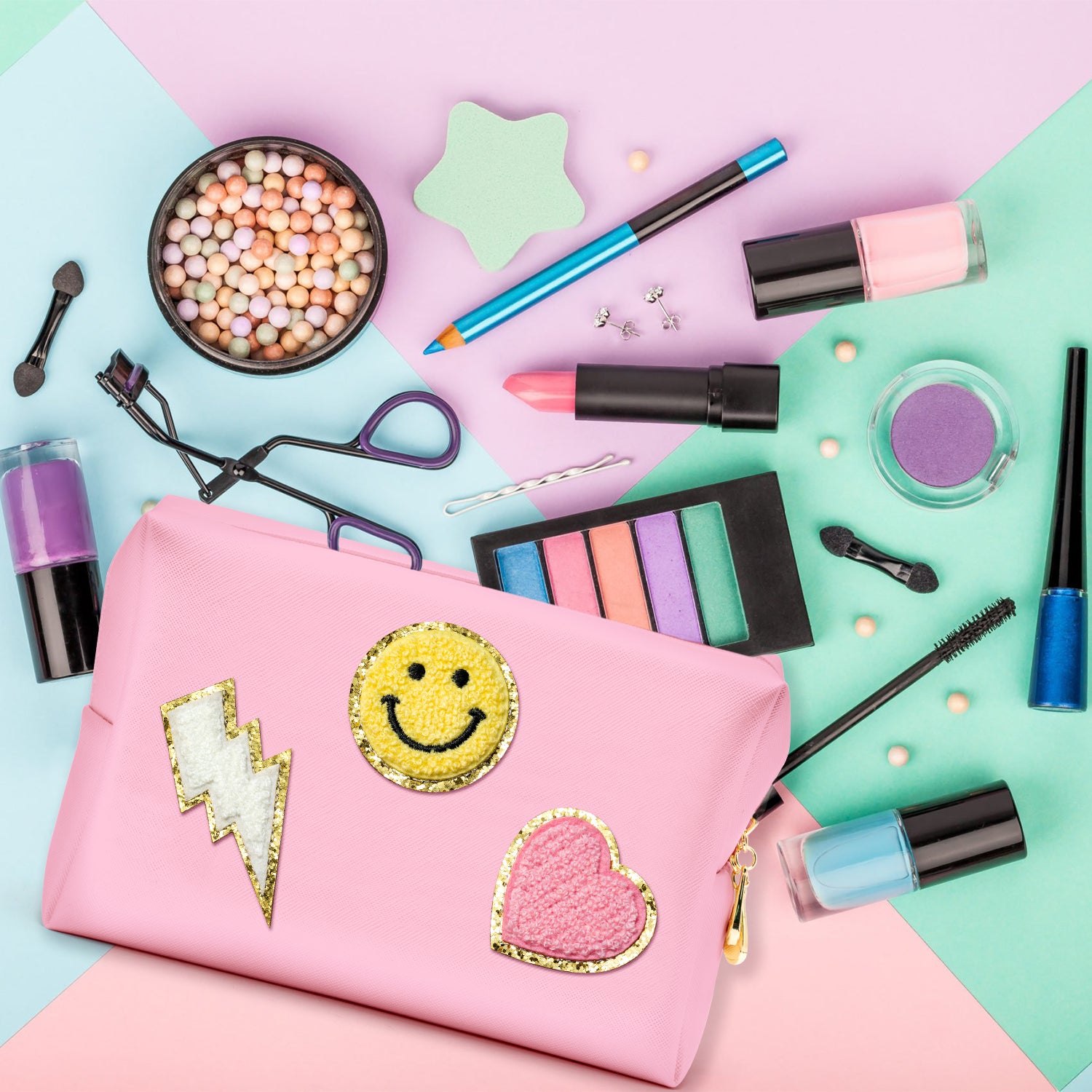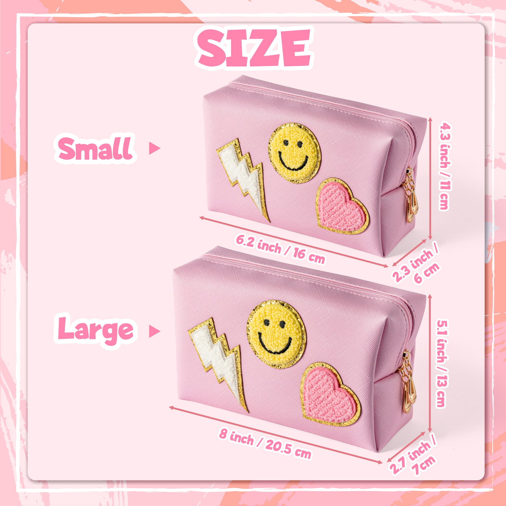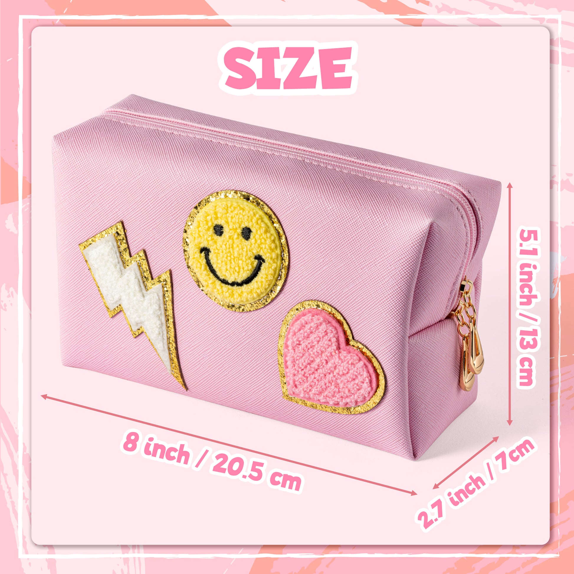 LieToi Preppy Patch Cosmetic Toiletry Bag, PU Leather Portable Waterproof Makeup Bag Smile Lightning Heart Organizer Compliant Bag Daily Travel Use Storage Purse for Women Girls (Large, Pink)