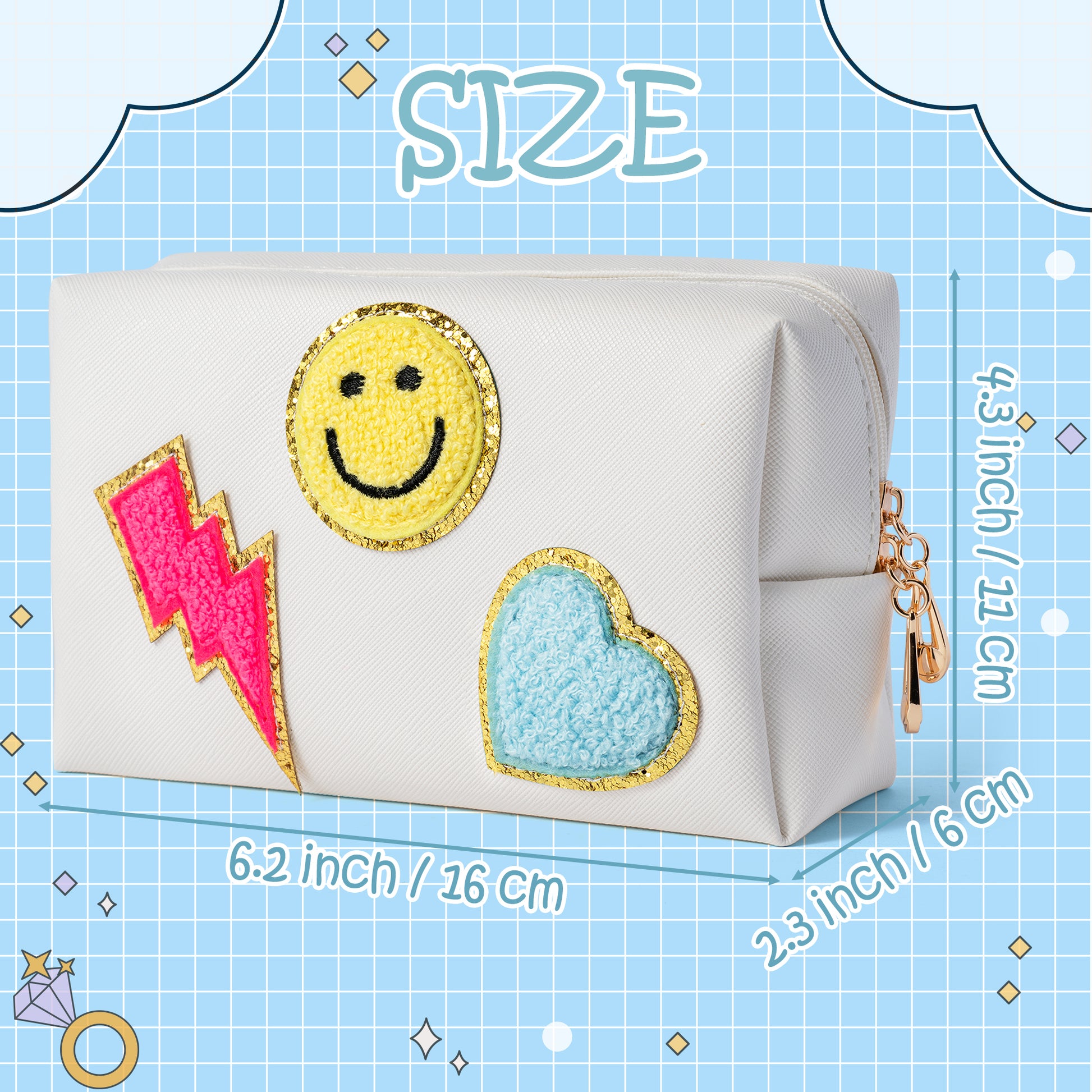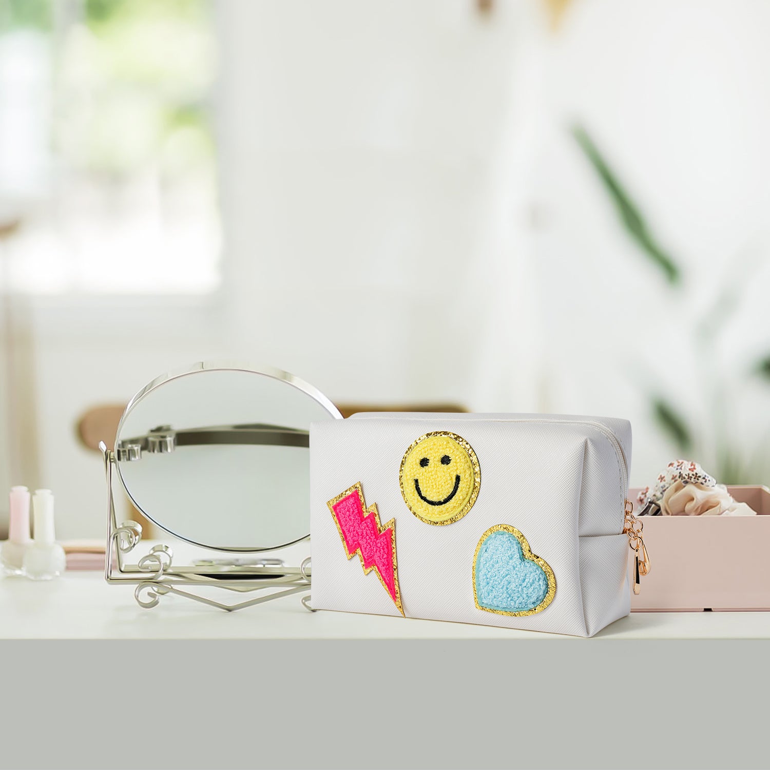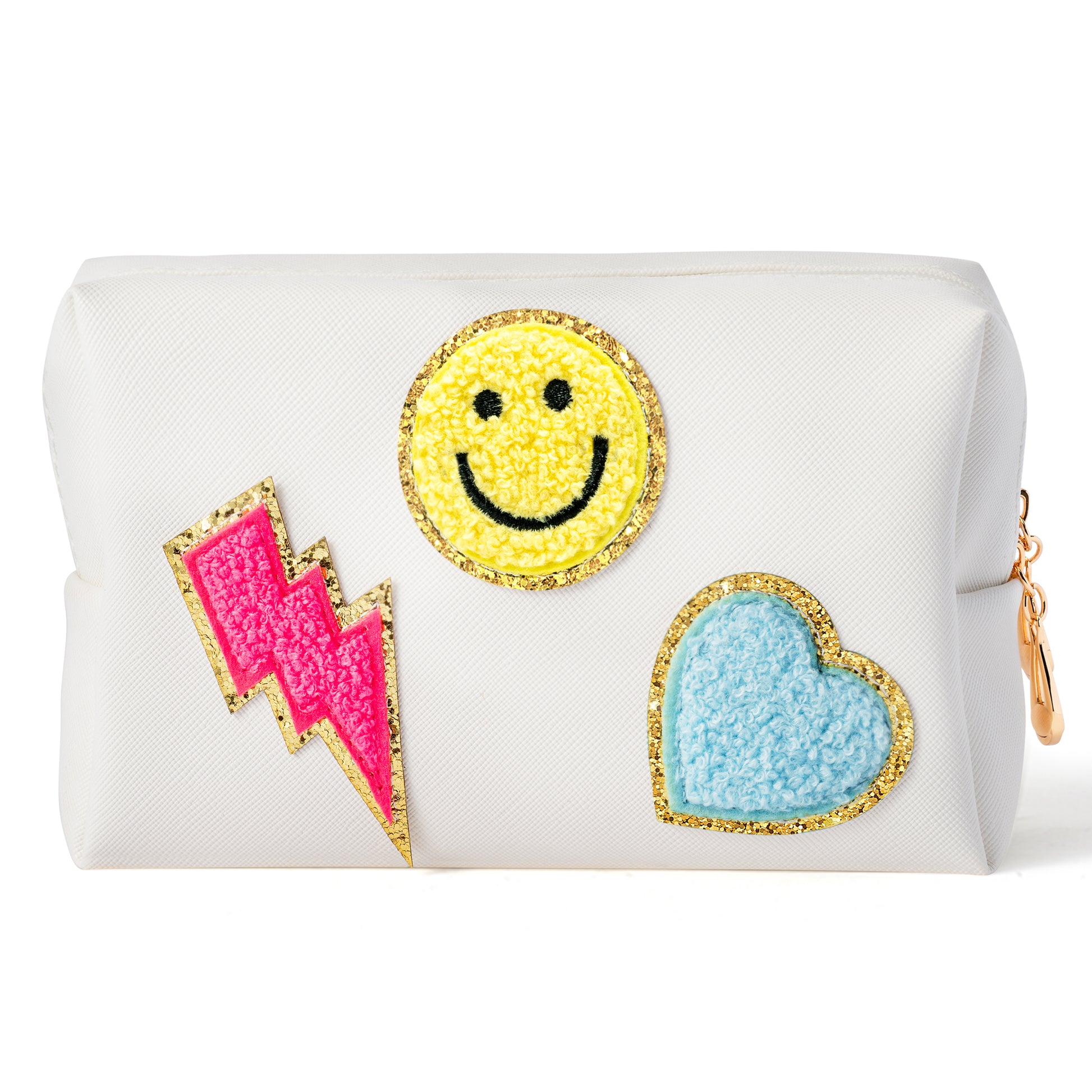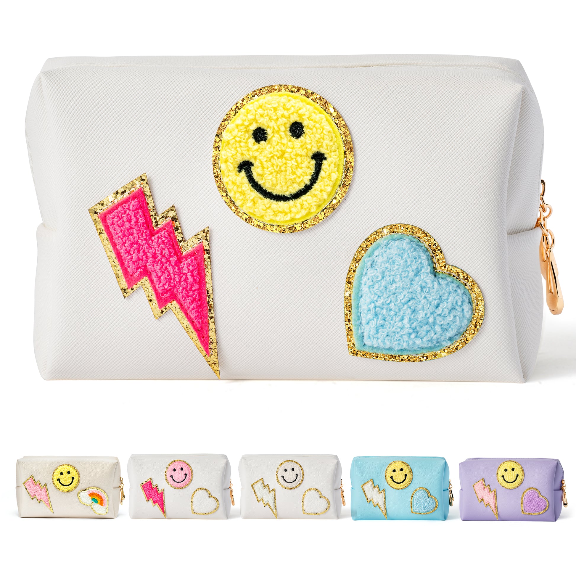 LieToi Preppy Patch Small Toiletry Bag, Smile Lightning Heart PU Leather Portable Waterproof Makeup Cosmetic Bag Daily Storage Purse Travel Organizer Compliant Bag for Women Girls (Rose Red Lightning)