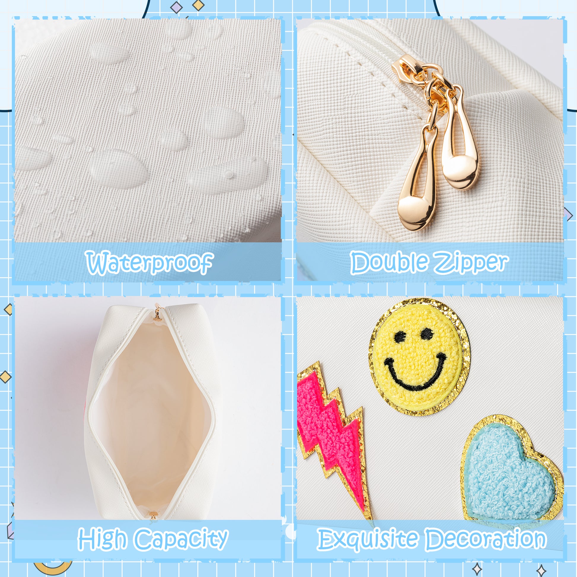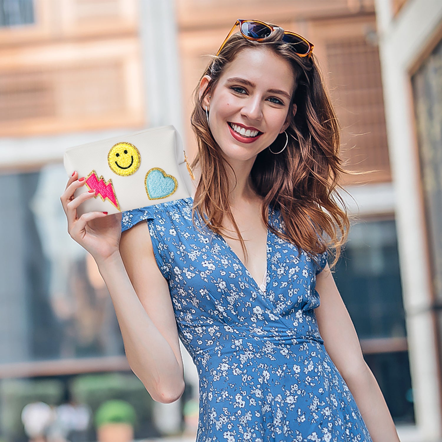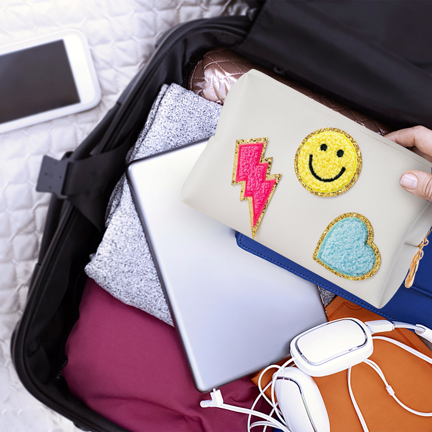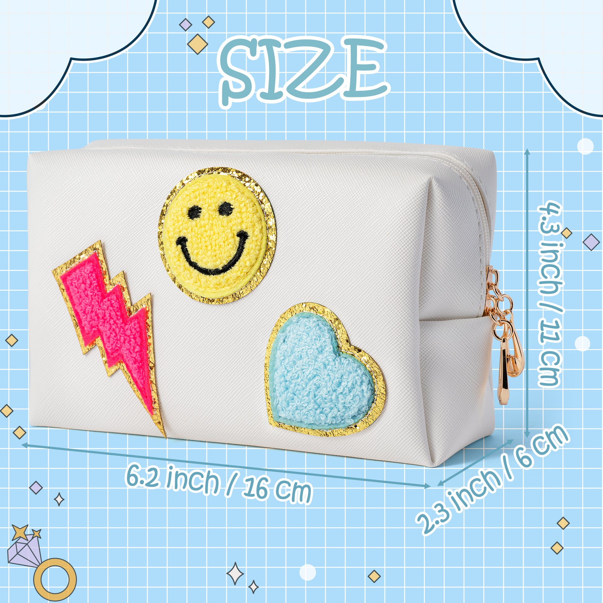 LieToi Preppy Patch Small Toiletry Bag, Smile Lightning Heart PU Leather Portable Waterproof Makeup Cosmetic Bag Daily Storage Purse Travel Organizer Compliant Bag for Women Girls (Rose Red Lightning)