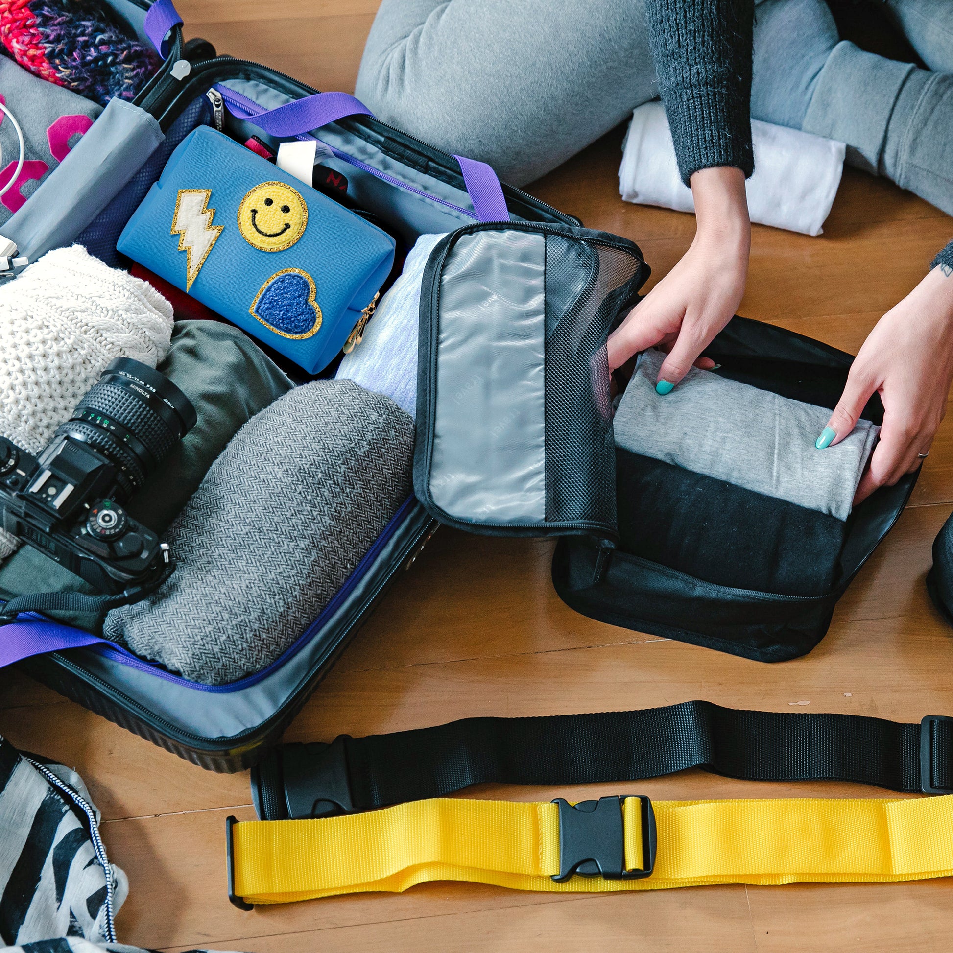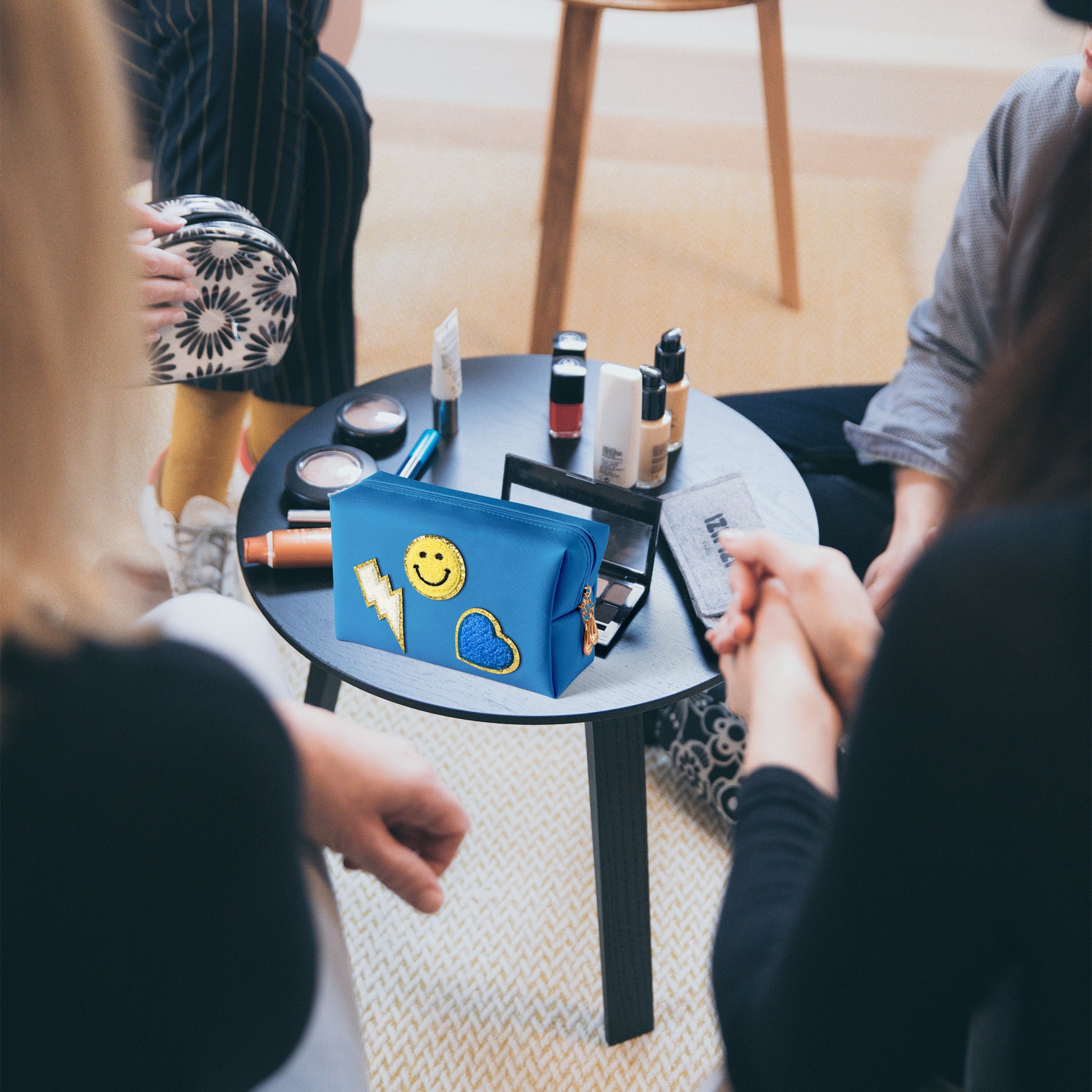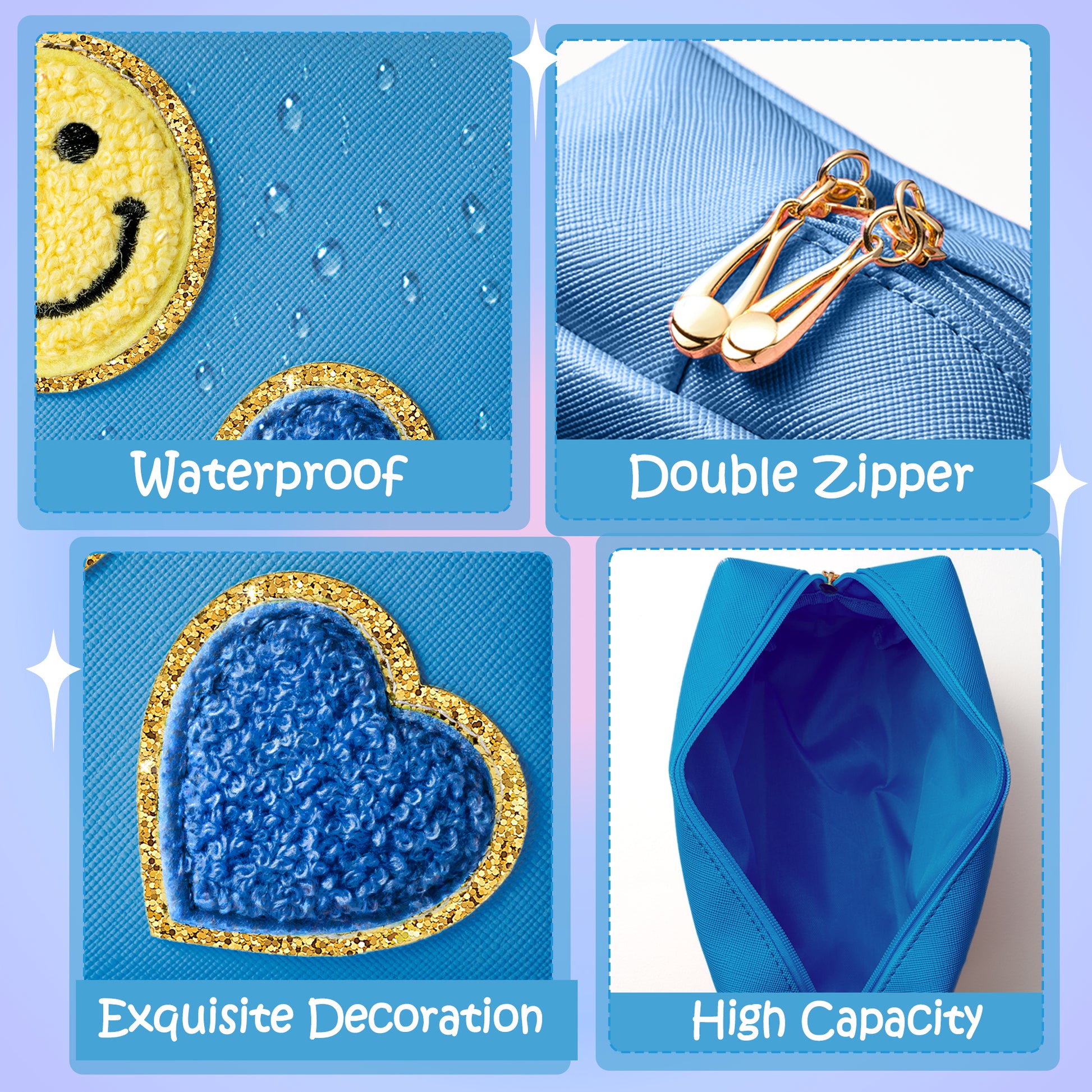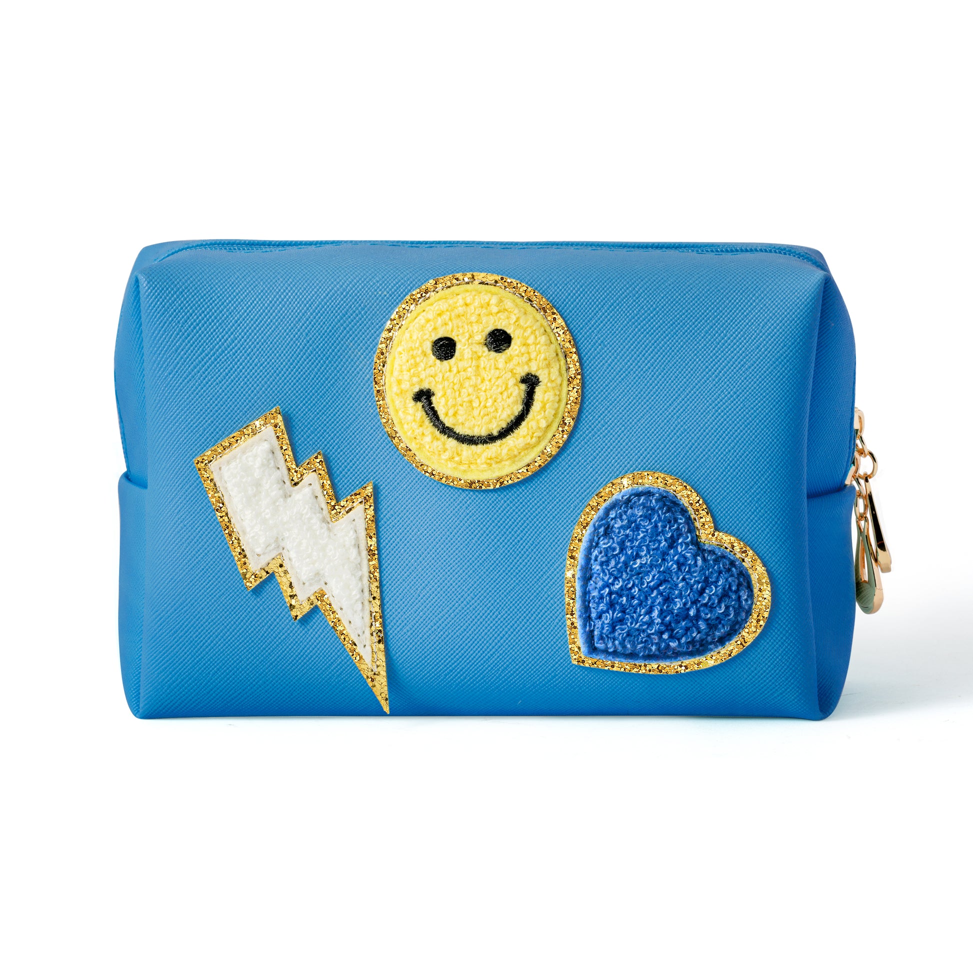 LieToi Preppy Patch Small Toiletry Bag, Smile Lightning Heart PU Leather Portable Waterproof Makeup Cosmetic Bag Daily Use Storage Purse Travel Organizer Compliant Bag for Women Girls (Bright Blue)