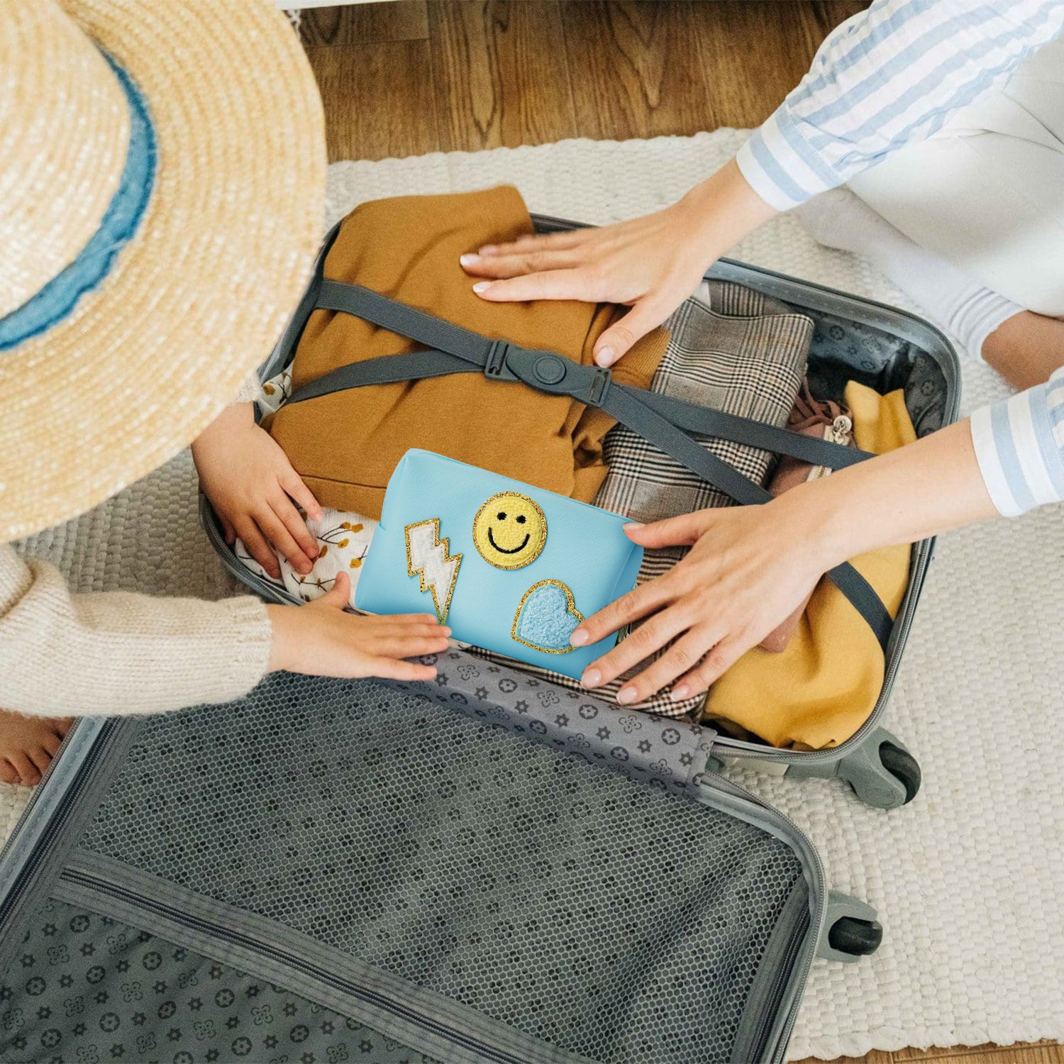 LieToi Preppy Patch Small Toiletry Bag, Smile Lightning Heart PU Leather Portable Waterproof Makeup Cosmetic Bag Daily Use Storage Purse Travel Organizer Compliant Bag for Women Girls (Canal Blue)