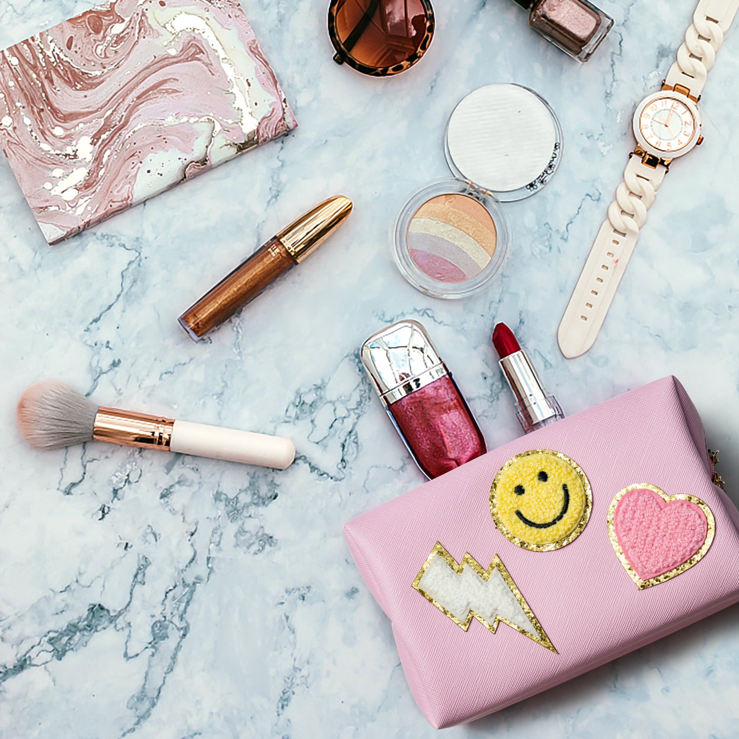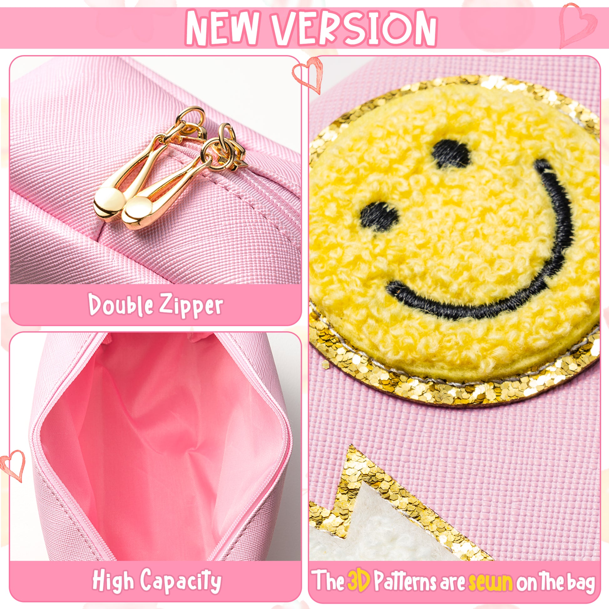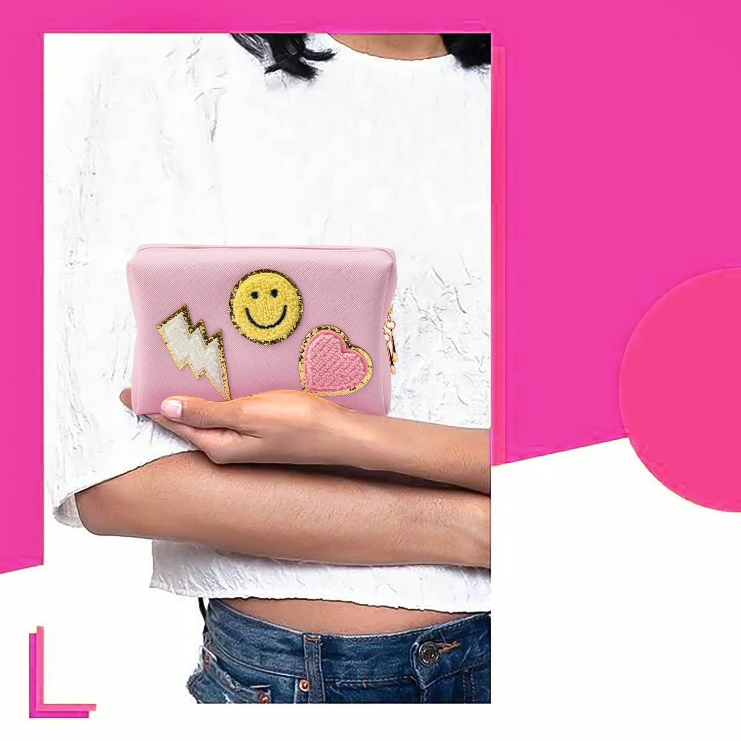 LieToi Preppy Patch Small Toiletry Bag Smile Lightning Heart PU Leather Portable Waterproof Makeup Cosmetic Bag Daily Use Storage Purse Travel Organizer Compliant Bag for Women Girls Gift (Pink)
