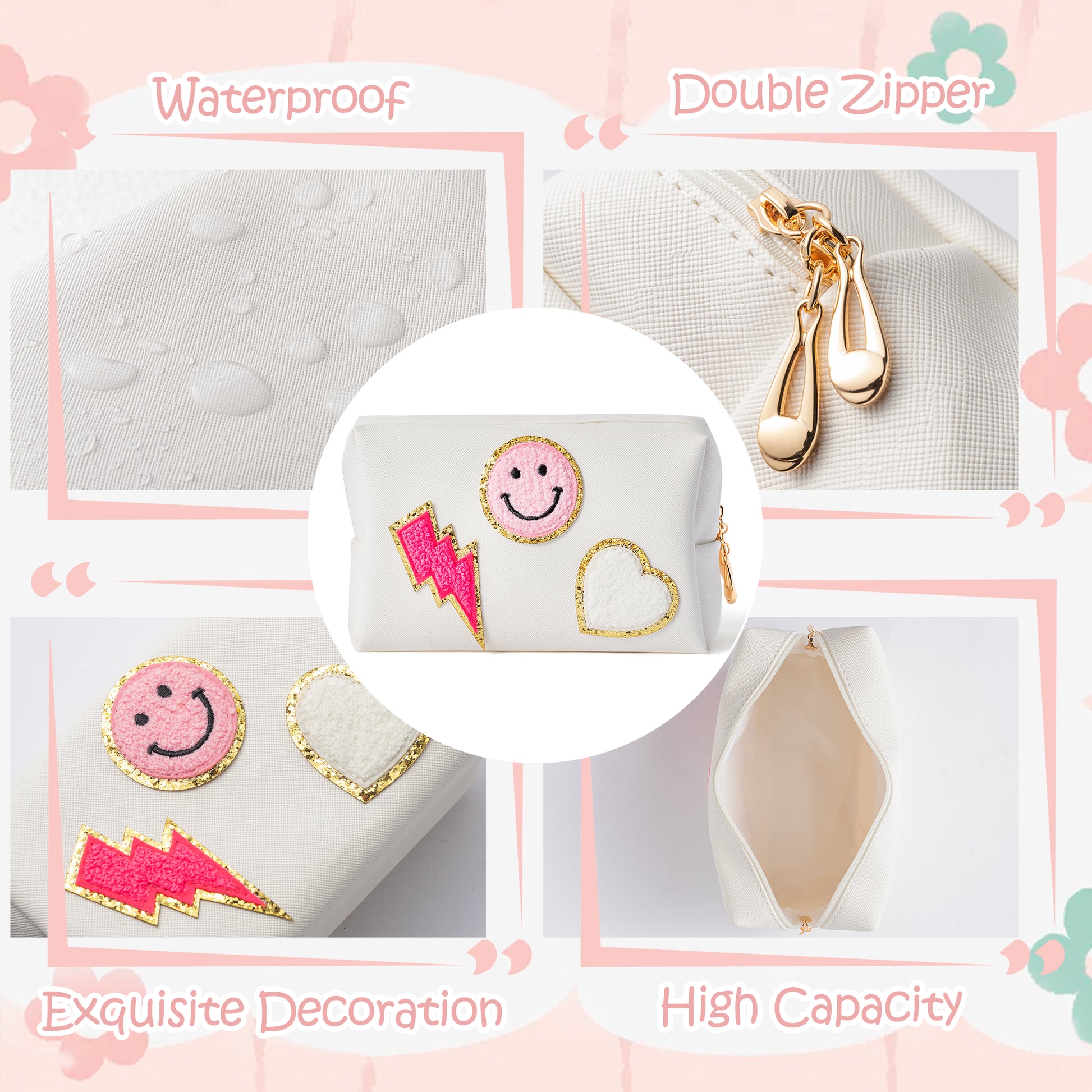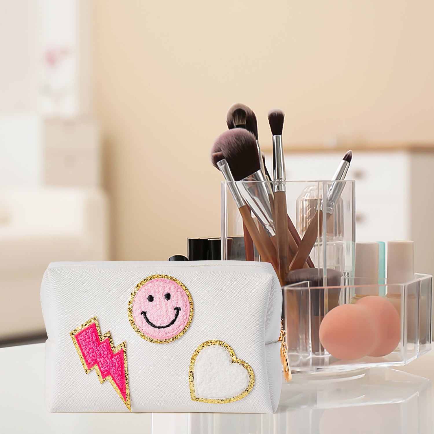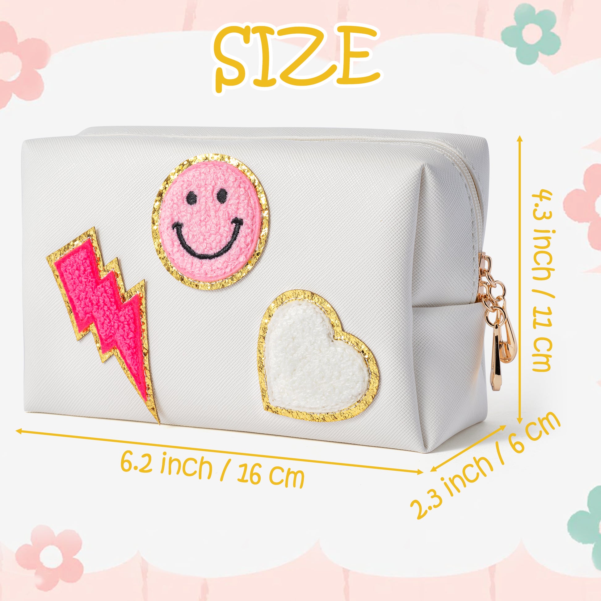 LieToi Preppy Patch Small Toiletry Bag, Smile Lightning Heart PU Leather Portable Waterproof Makeup Cosmetic Bag Daily Use Storage Purse Travel Organizer Compliant Bag for Women Girls Gift (White)