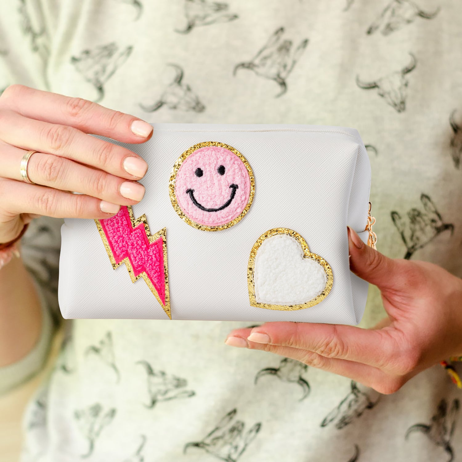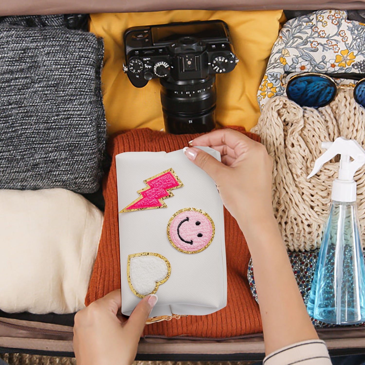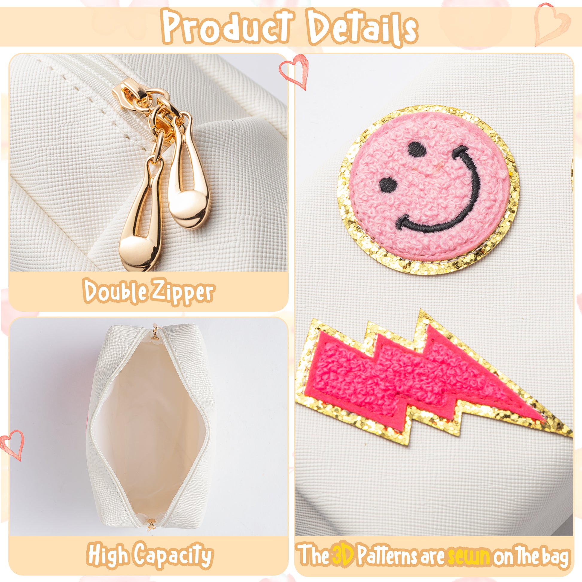 LieToi Preppy Patch Small Toiletry Bag, Smile Lightning Heart PU Leather Portable Waterproof Makeup Cosmetic Bag Daily Use Storage Purse Travel Organizer Compliant Bag for Women Girls Gift (White)