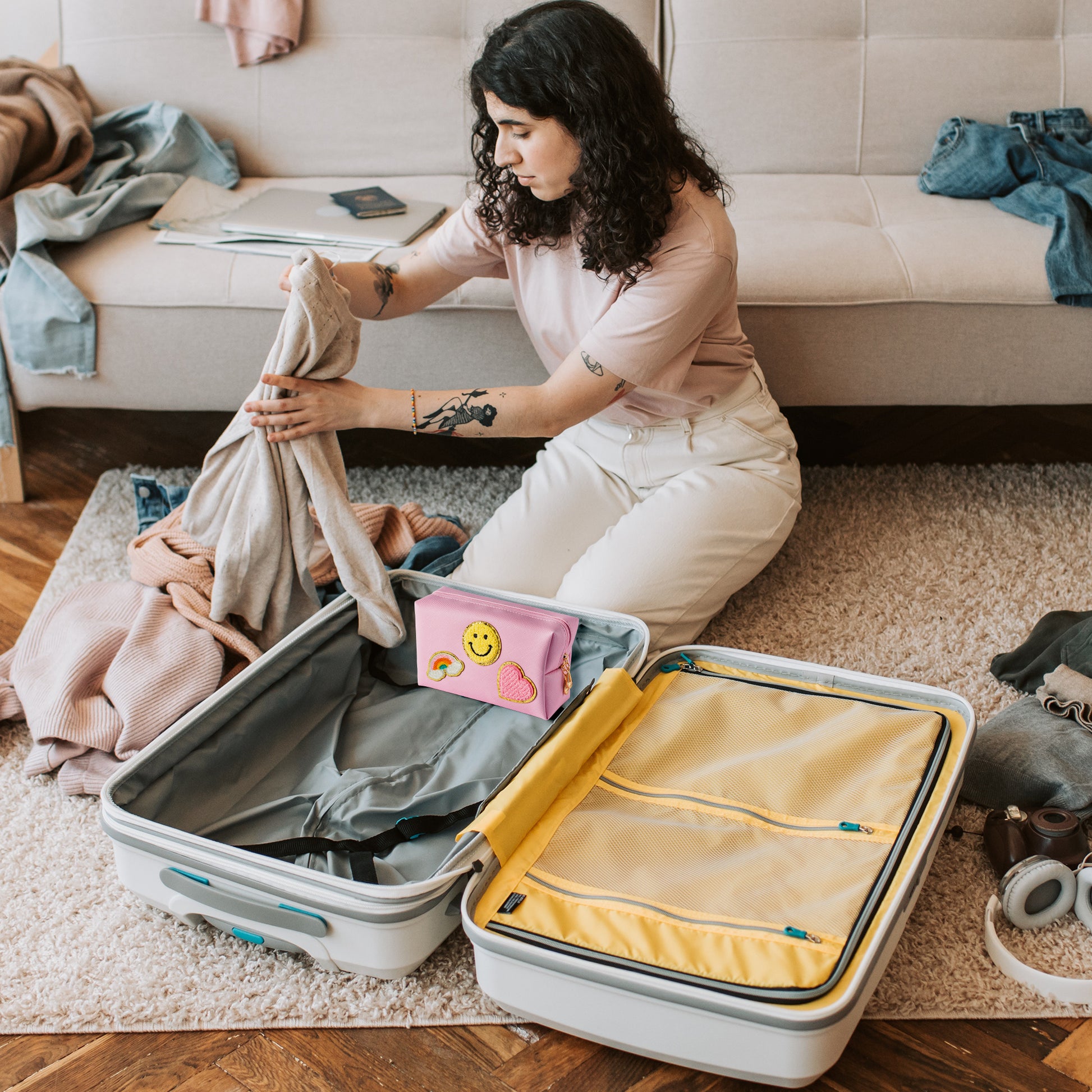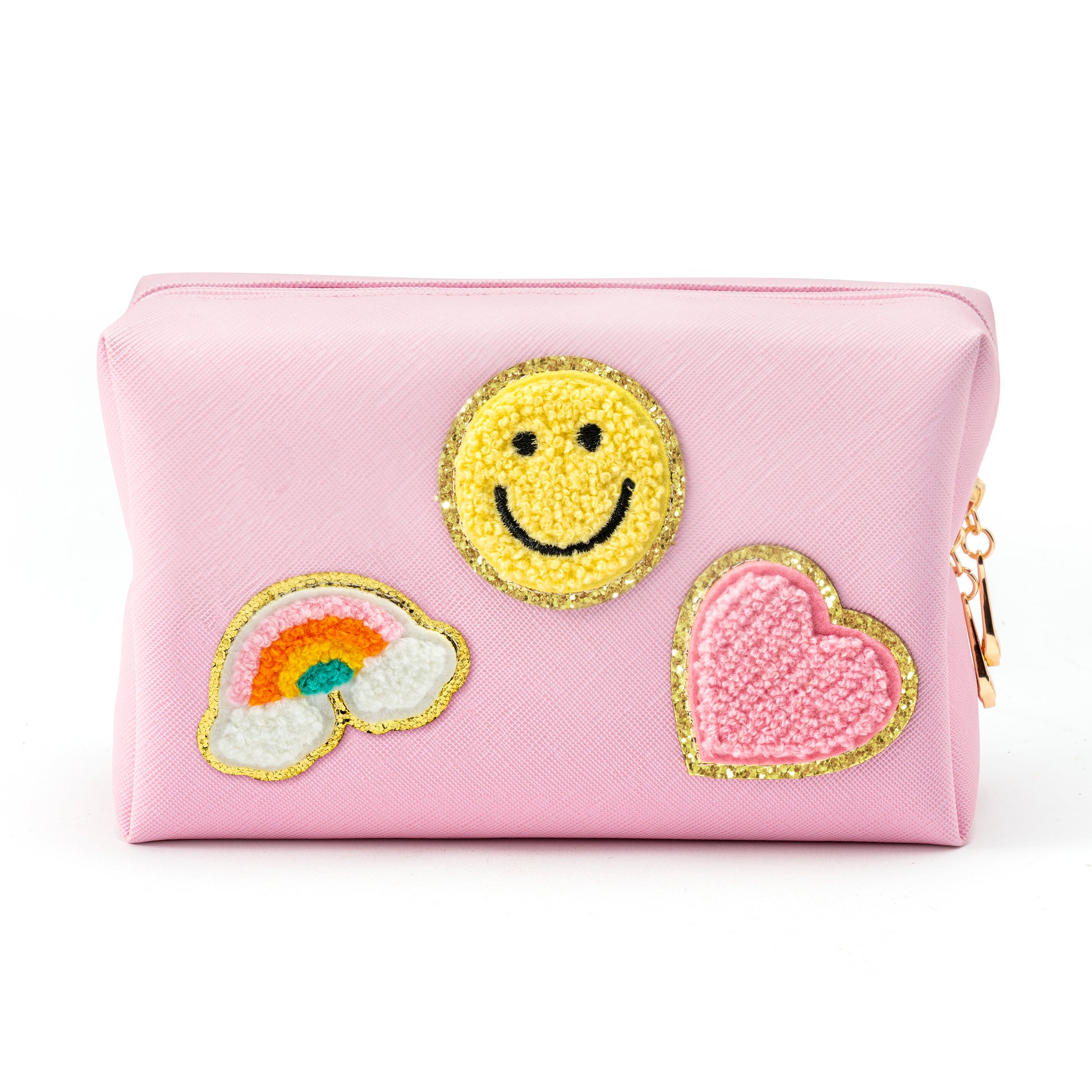 LieToi Preppy Patch Small Toiletry Bag, Smile Rainbow Heart PU Leather Portable Waterproof Makeup Cosmetic Bag Daily Use Storage Purse Travel Organizer Compliant Bag for Women Girls (Light Pink)
